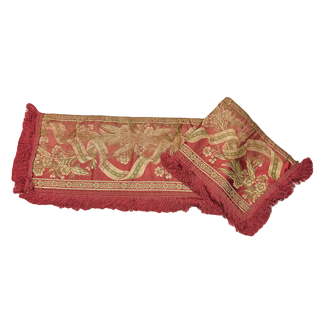 RED AND GOLD DAMASK VALANCE WITH FRINGE EDGE FLORAL DESIGN 4'7'' X 1'3''