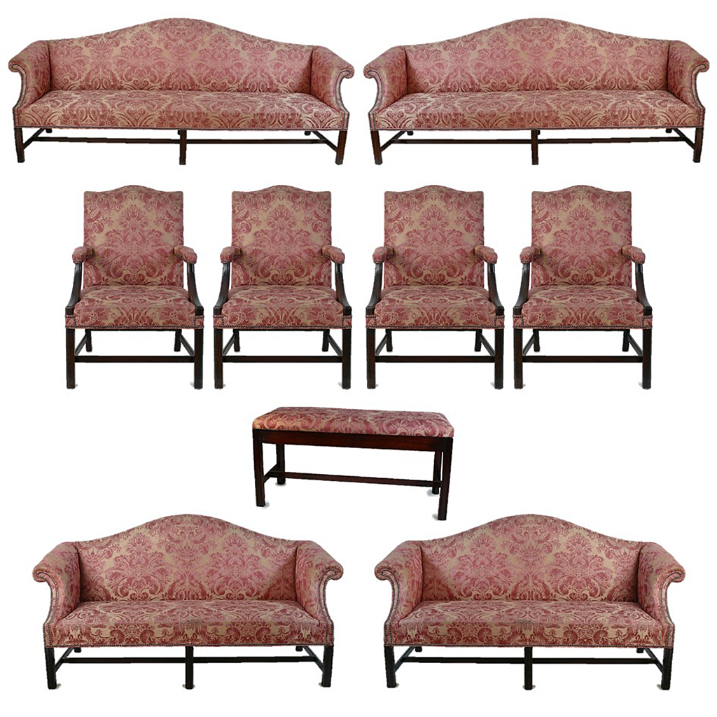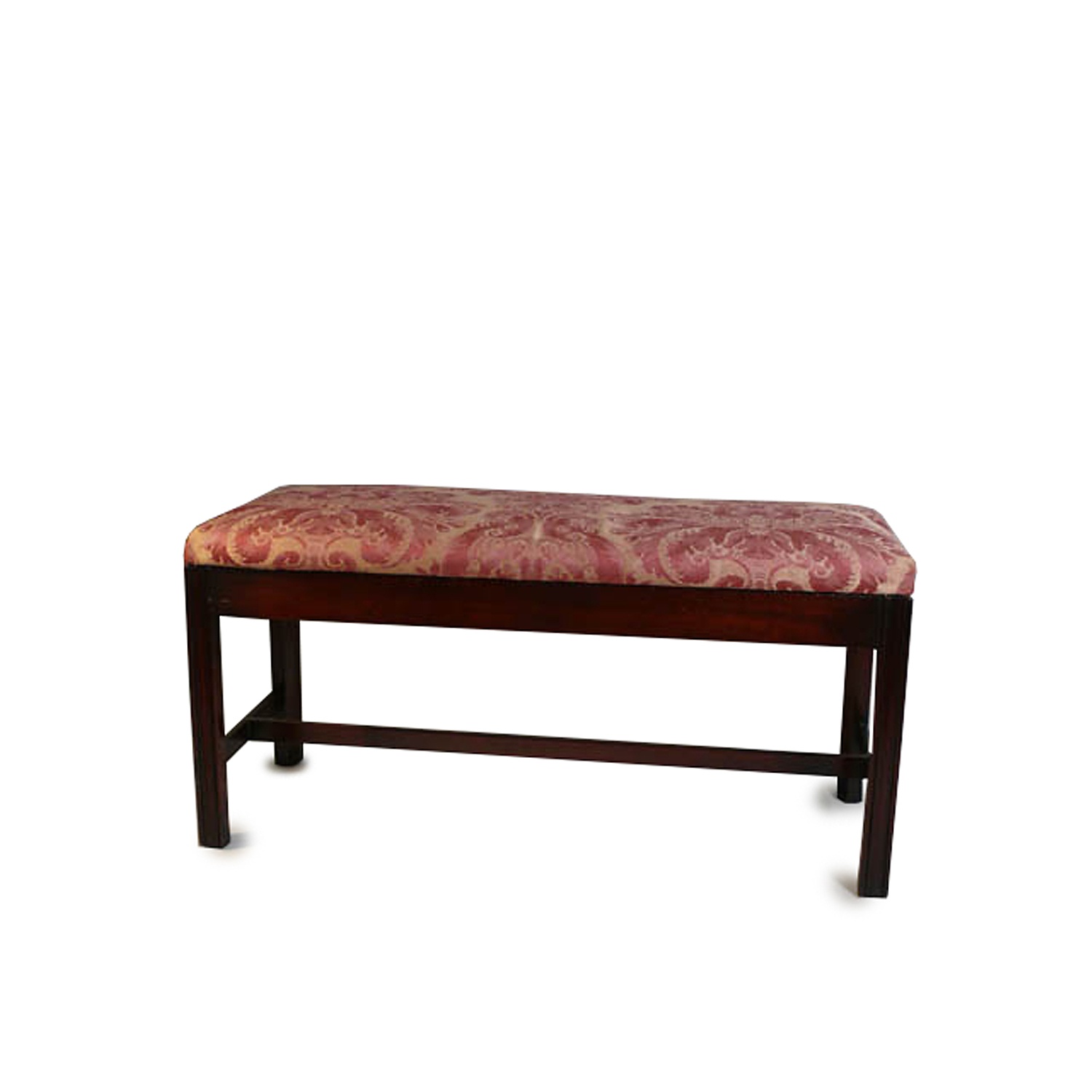 RED GOLD DAMASK UPHOLSTERED DUET PIANO STOOL / BENCH WITH SIMPLE MAHOGANY FRAME ENGLISH 18TH CENT STYLE 52 CM HIGH 107 CM LONG 41 CM WIDE