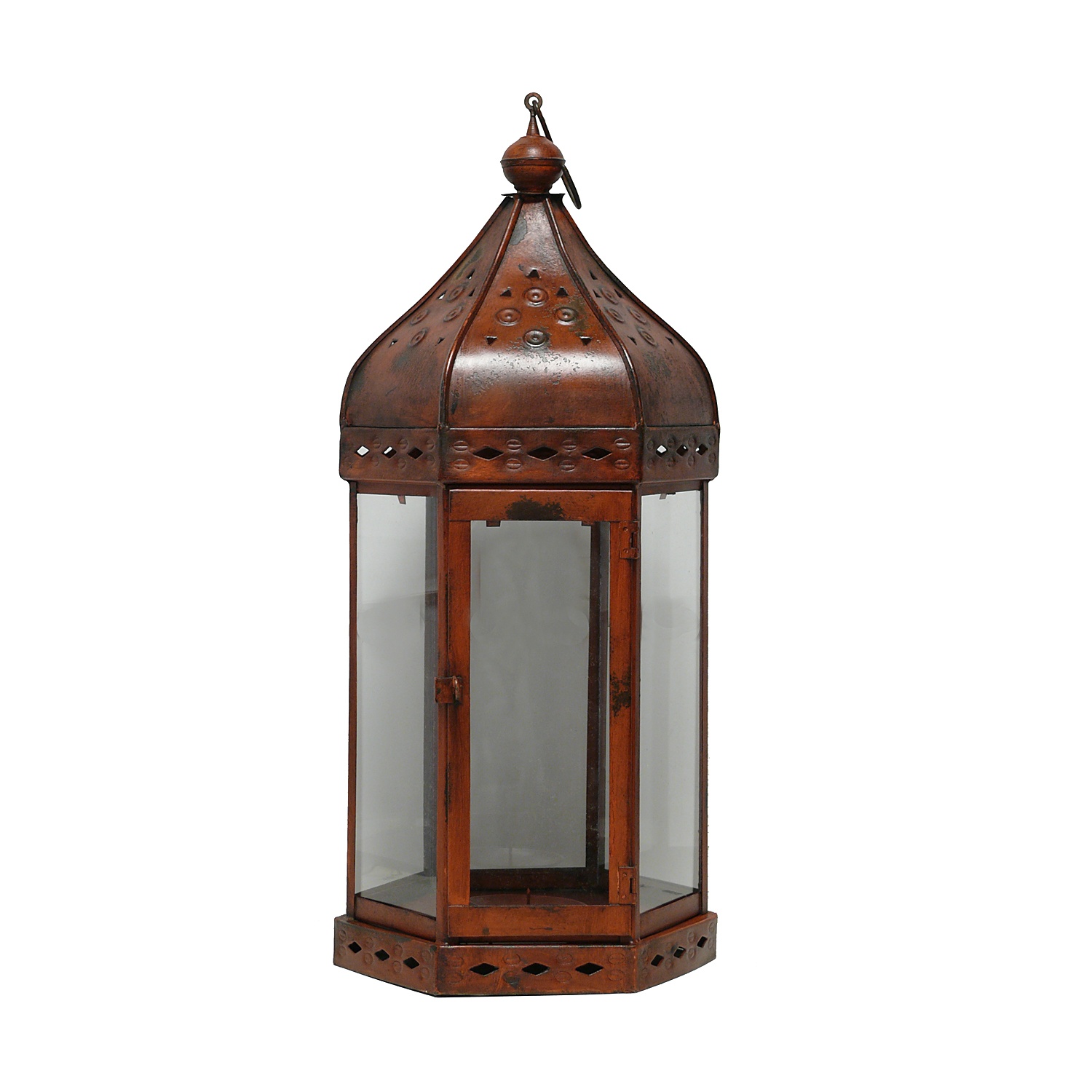 RED PAINTED IRON LANTERN HEXAGONAL WITH PAGODA TOP 67 CM HIGH 30 CM WIDE