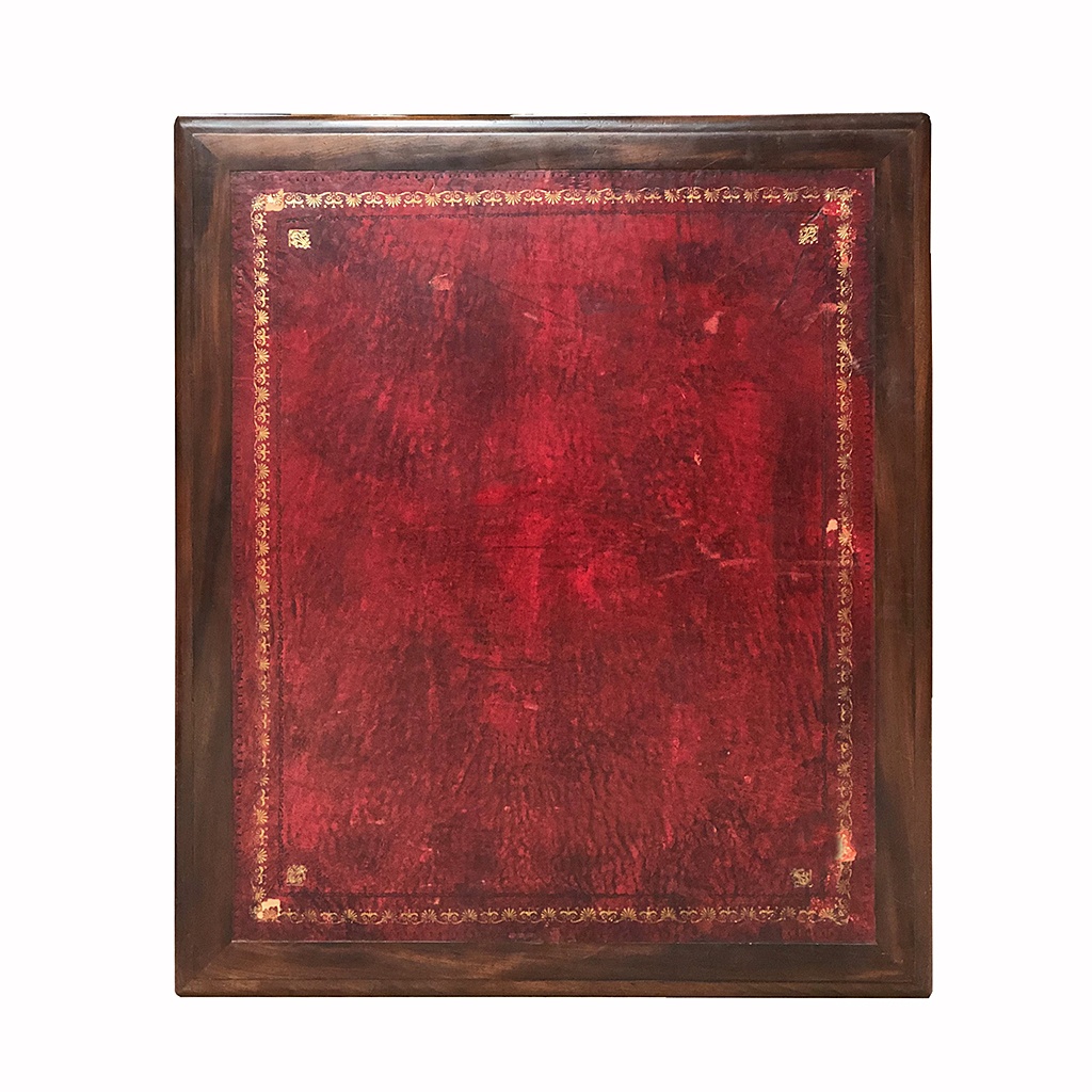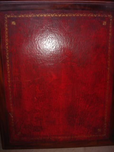 RED TOOLED LEATHER TABLE TOP WITH MAHOGANY BORDER / EDGE 30/i X 36/i