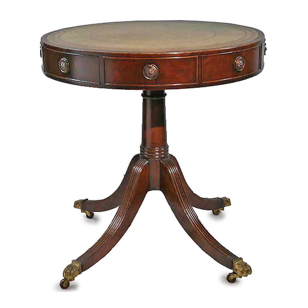 REGENCY STYLE CIRCULAR DRUM LIBRARY TABLE MAHOGANY WITH PALE GREEN LEATHER TOP 80 CM HIGH 90 CM DIAM