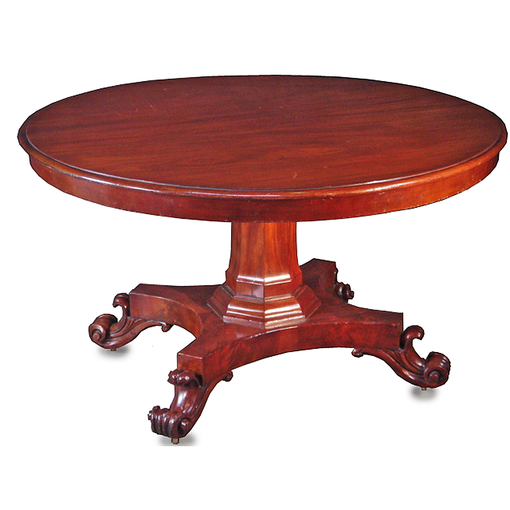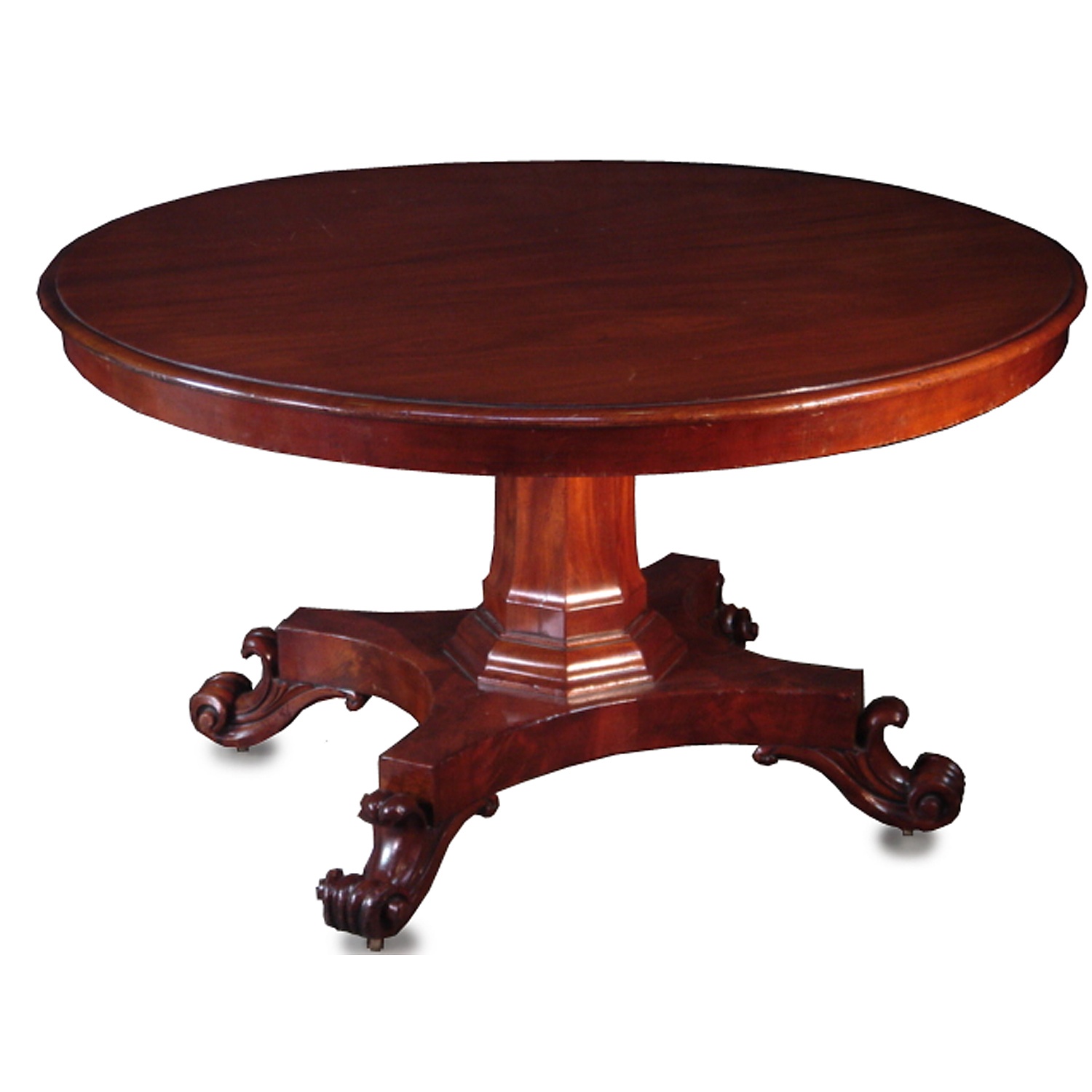 REGENCY CIRCULAR MAHOGANY BREAKFAST TABLE PEDESTAL BASE WITH FOUR CARVED FEET 4'2 DIAM