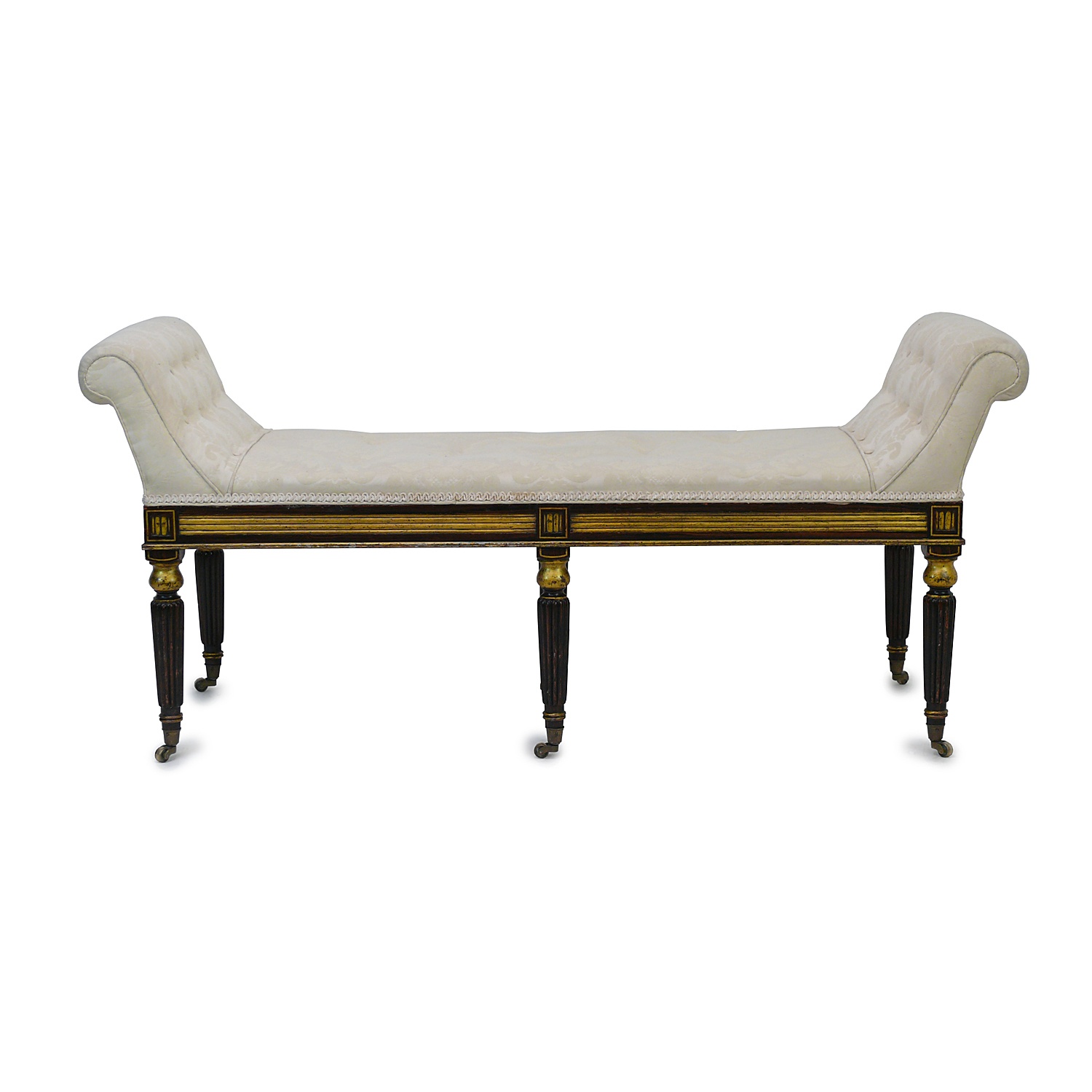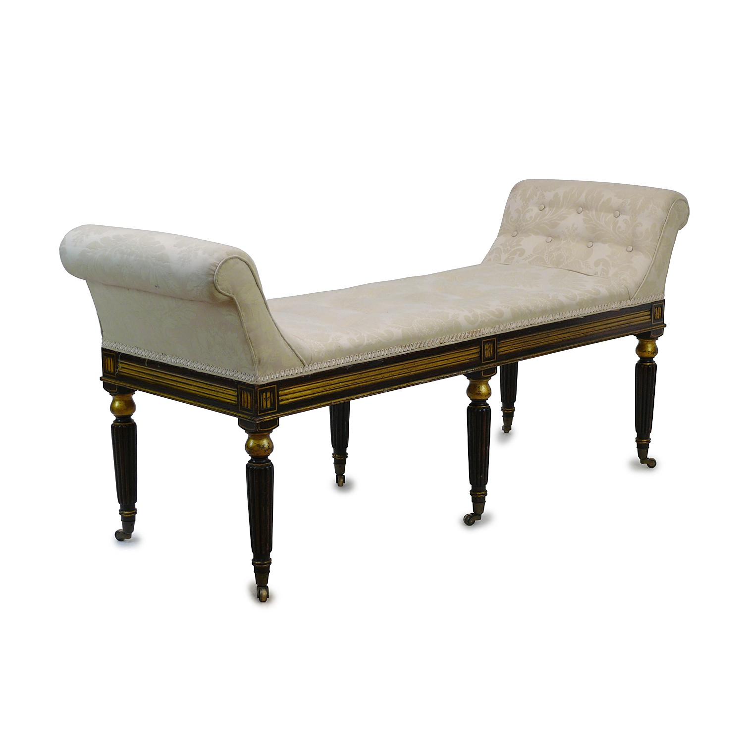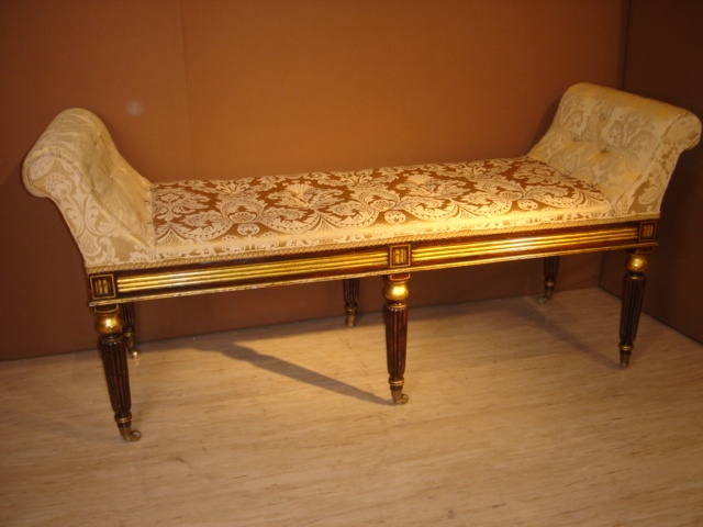 REGENCY FAUX ROSEWOOD AND GILT BANQUETTE STOOL / WINDOW SEAT SIX LEG WITH GOLD DAMASK FLY BUTTONED SILK UPHOLSTERY 4'11/i L 2'3/i H 150 CM X 69 CM (X2)