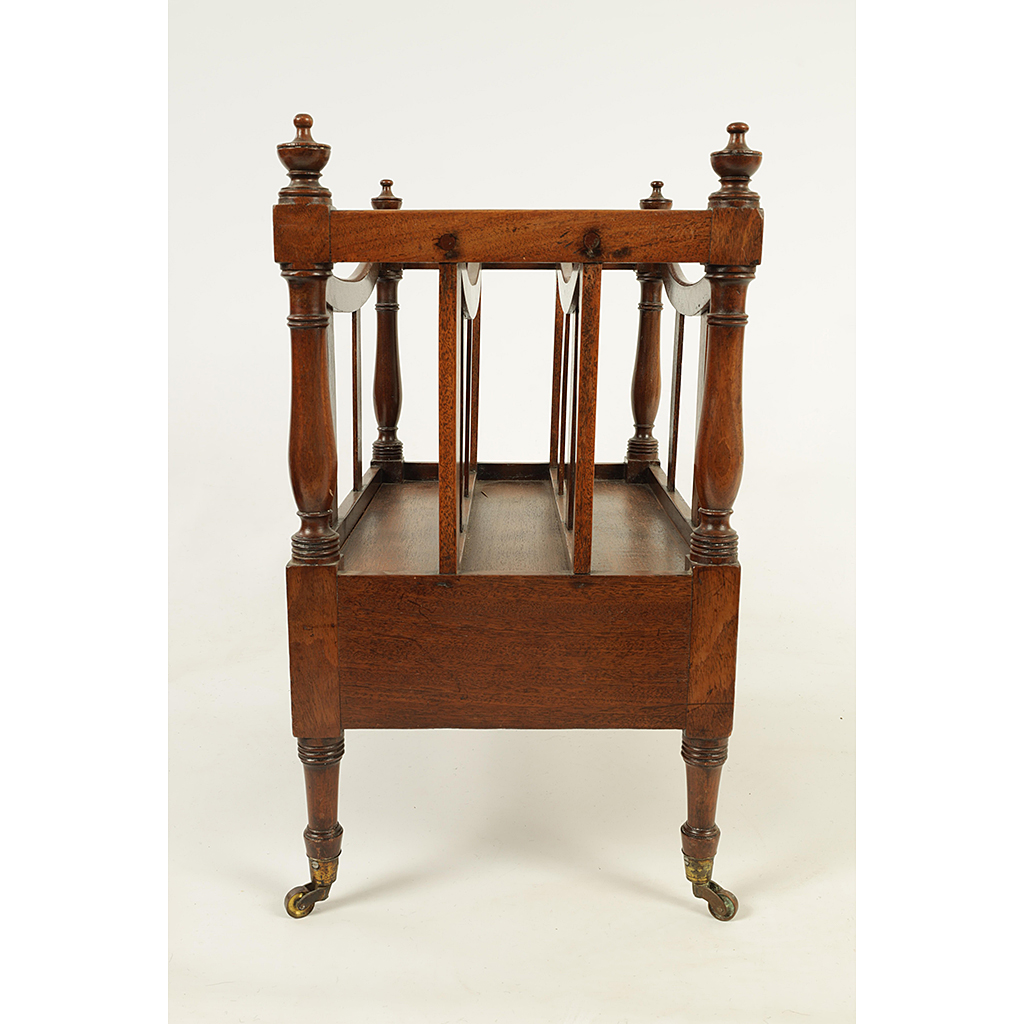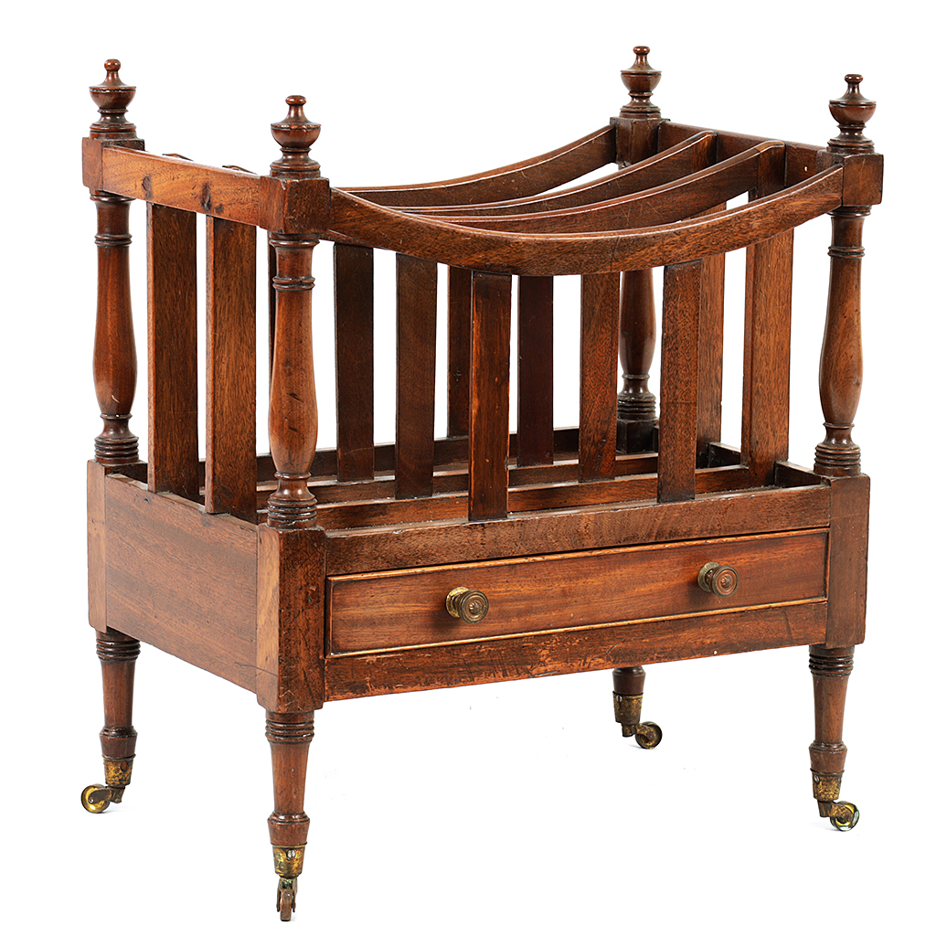REGENCY MAHOGANY CANTERBURY MAGAZINE RACK SLATTED DISHED TOP ABOVE SINGLE DRAWER ON TURNED LEGS WITH CASTORS 51 CM HIGH 44 CM WIDE 29 CM DEEP