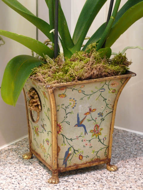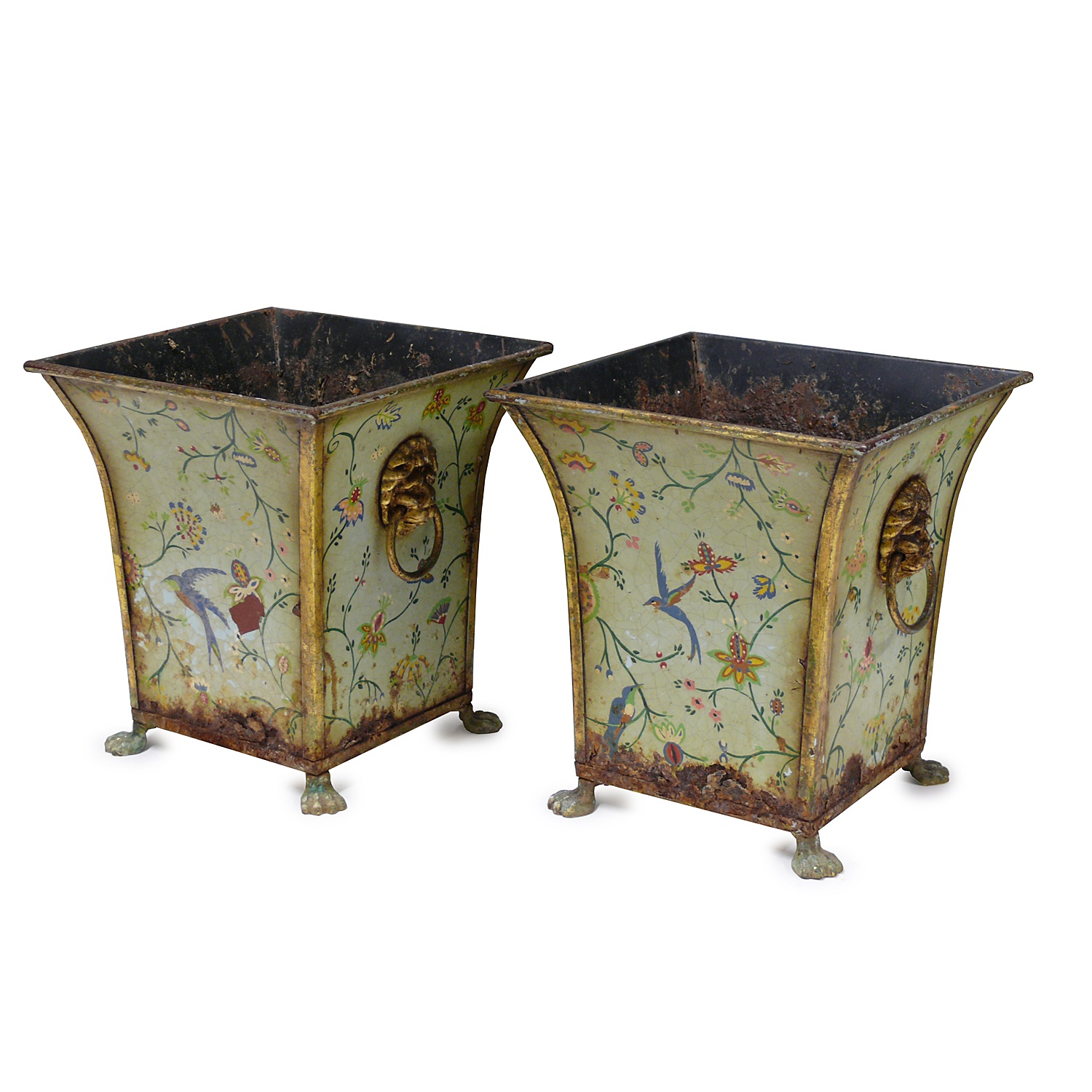 REGENCY STYLE BLUE TOLL / TIN VASE / JARDINIERE FLORAL PATTERN WITH LION RING HANDLES 19 CM HIGH (X2)