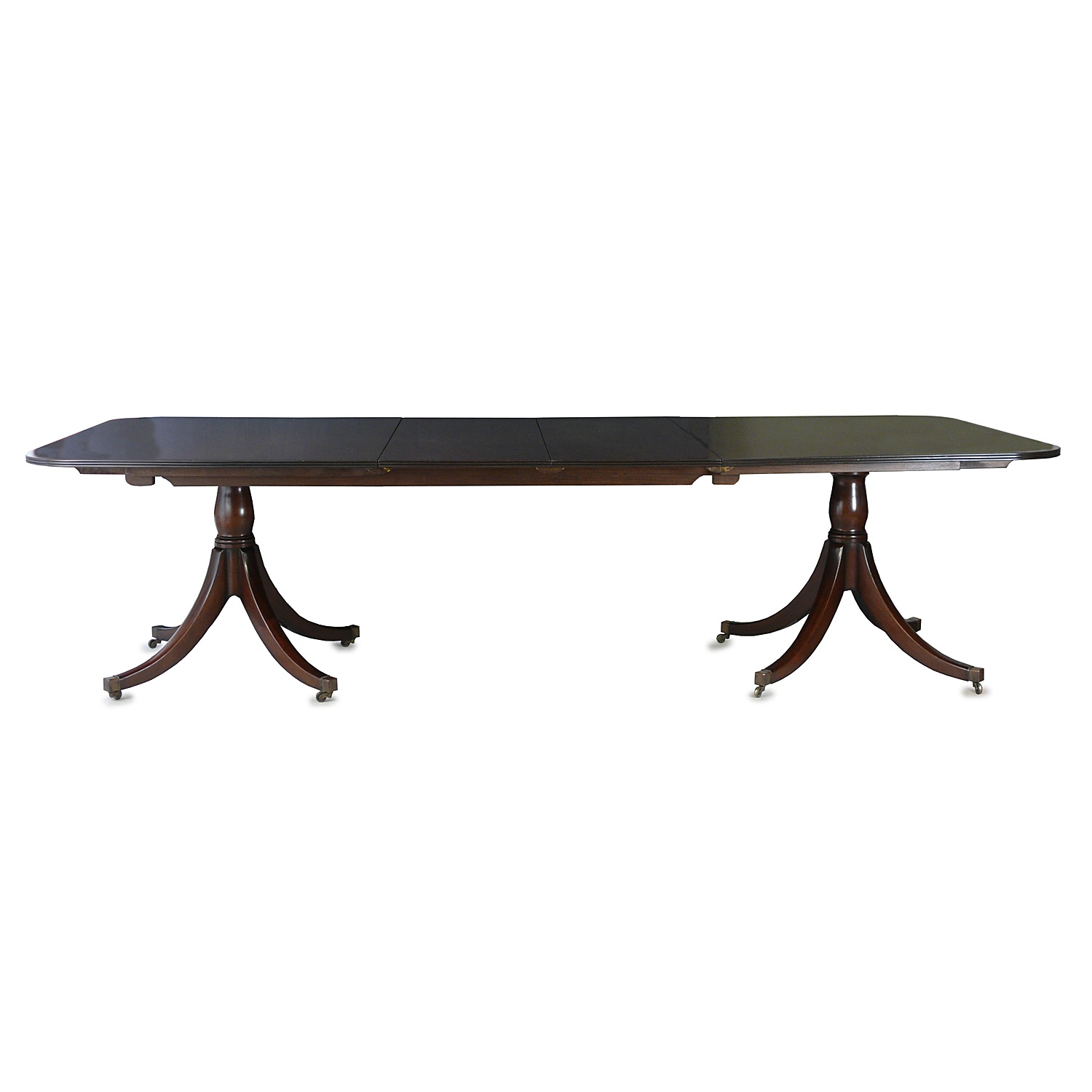 REGENCY STYLE DARK MAHOGANY DINING TABLE TWIN PEDESTAL FOUR LEG WITH TWO LARGE AND TWO SMALL LEAVES 74 CM HIGH 288 CM LONG 120 CM WIDE
