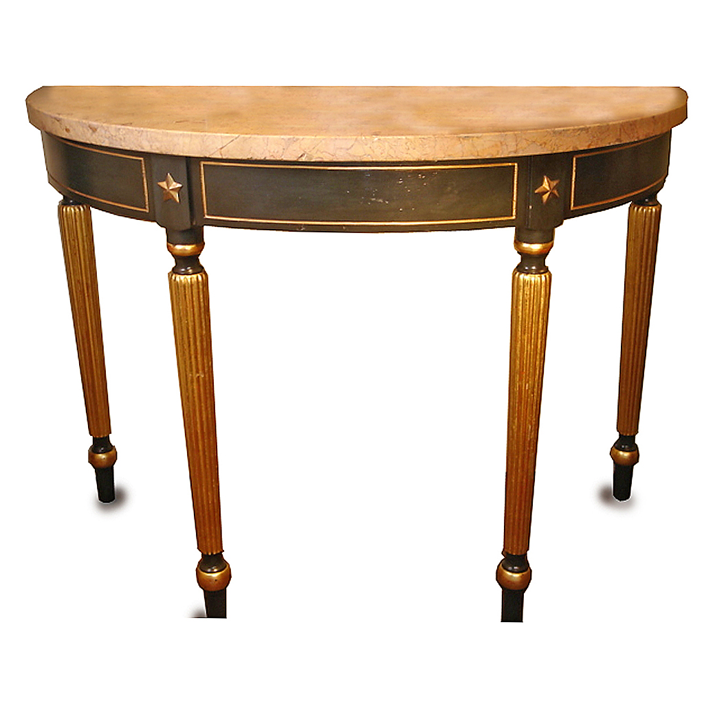 REGENCY STYLE DEMI LUNE CONSOLE TABLE FAUX BRONZE AND GILT BASE WITH AMBER HAUTEVILLE MARBLE TOP 3'8/i WIDE (X2)