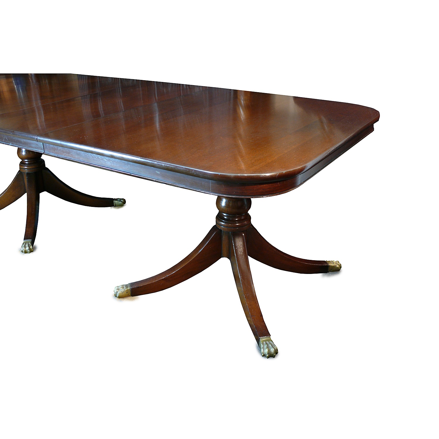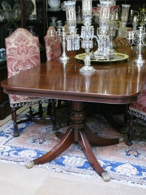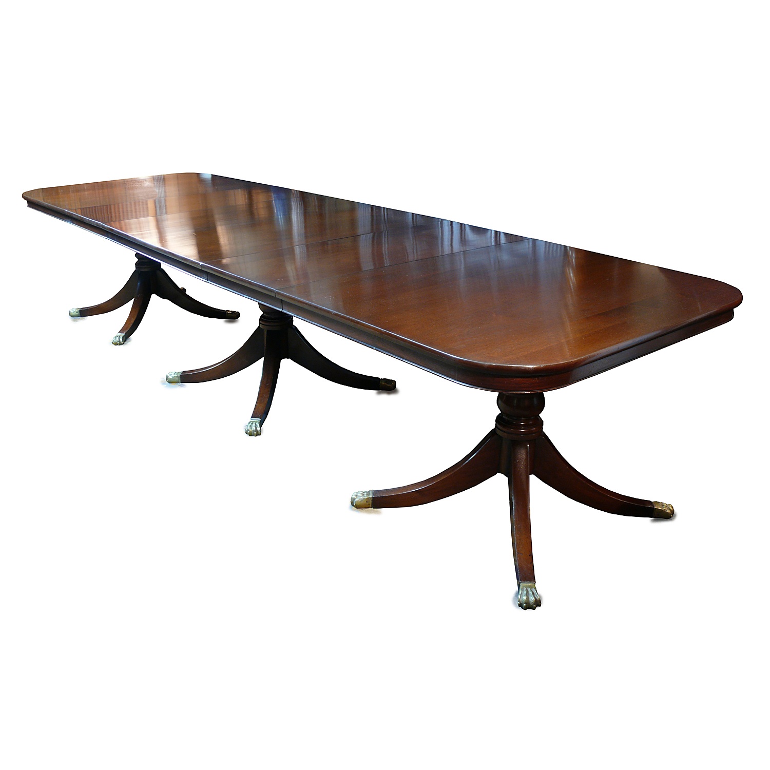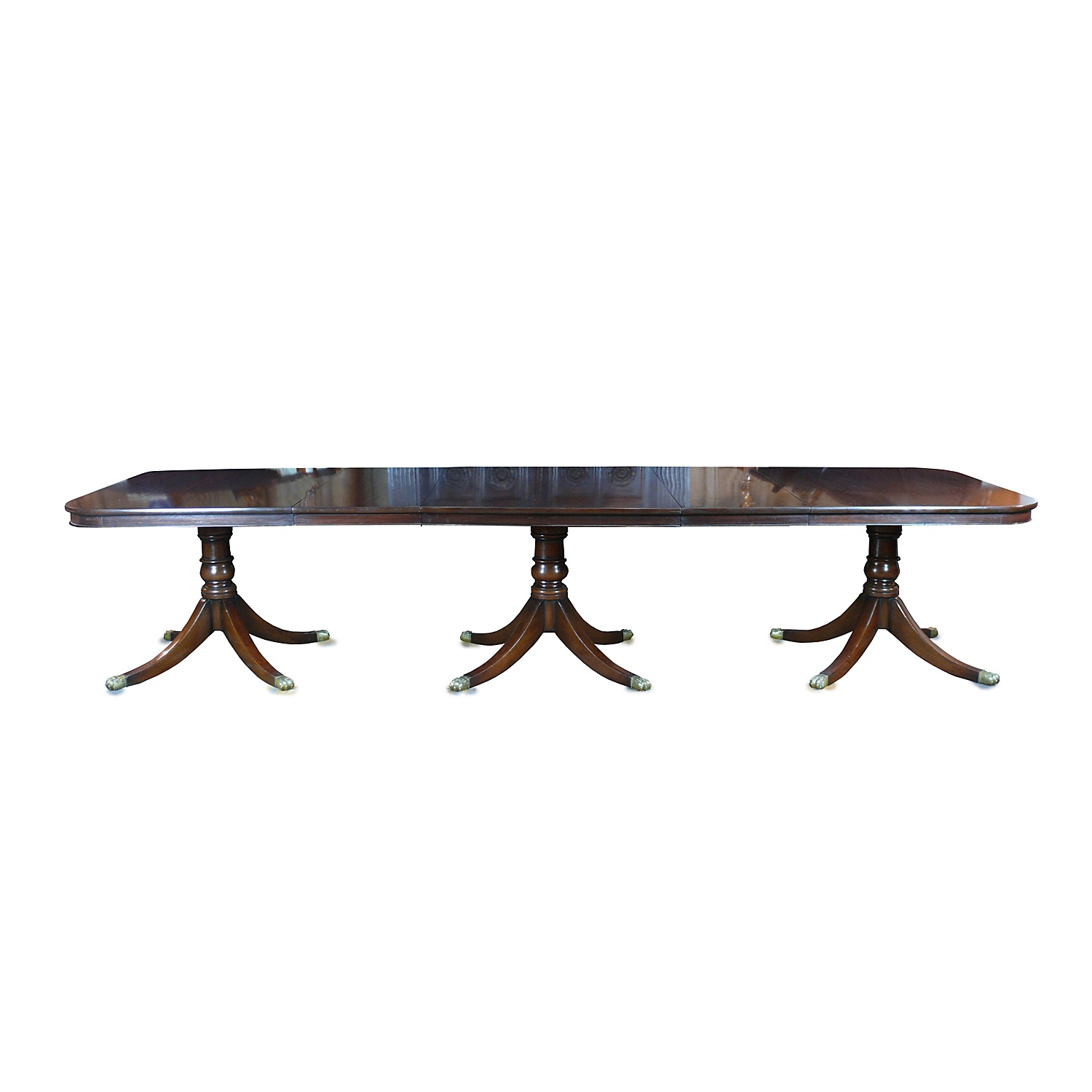 REGENCY STYLE DINING TABLE LIGHT MAHOGANY WITH TRIPLE PEDESTAL (FOUR LEG) AND TWO LEAVES DEEP BULL NOSE EDGE 11'11/i X 3'9/i 73 CM HIGH 364 CM LONG 114 CM WIDE
