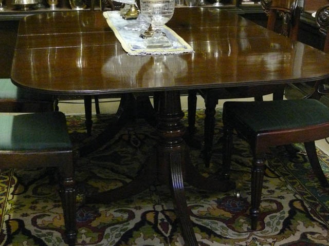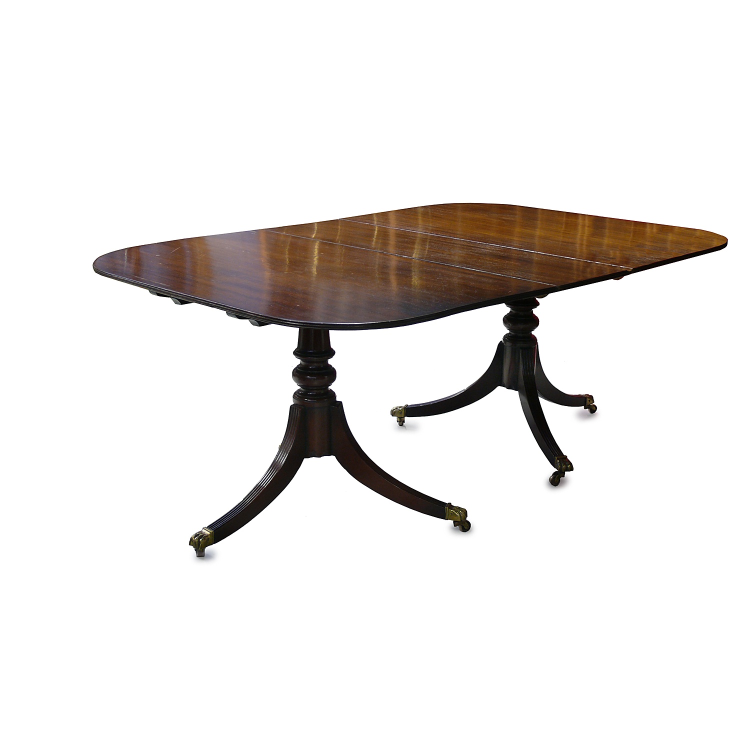 REGENCY STYLE MAHOGANY DINING TABLE 2 PEDESTALS (TRI LEG) ONE LEAF REEDED EDGE6' 1/i LONG 4' WIDE 73 CM HIGH 186 CM LONG 122 CM WIDE