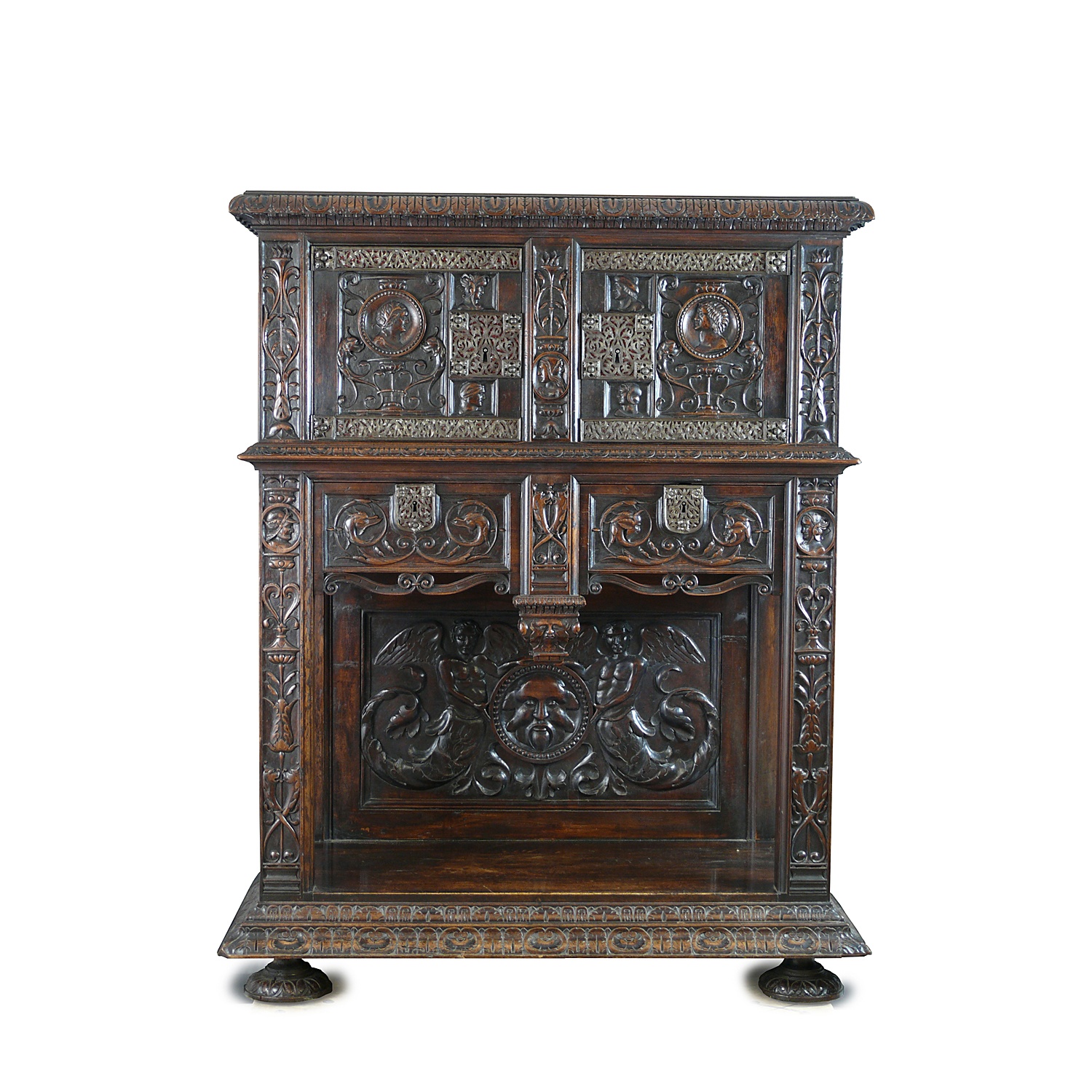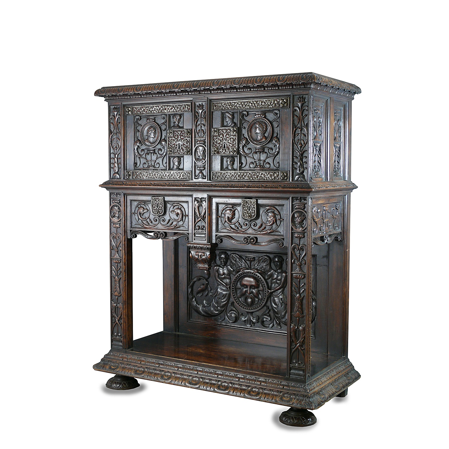 RENASSIANCE STYLE DRESSOIR / CUPBOARD ORNATE CARVED WALNUT WITH PORTRAIT MEDALLIONS TO THE DOORS AND ORNATE PIERCED LOCK PLATES ON BUN FEET