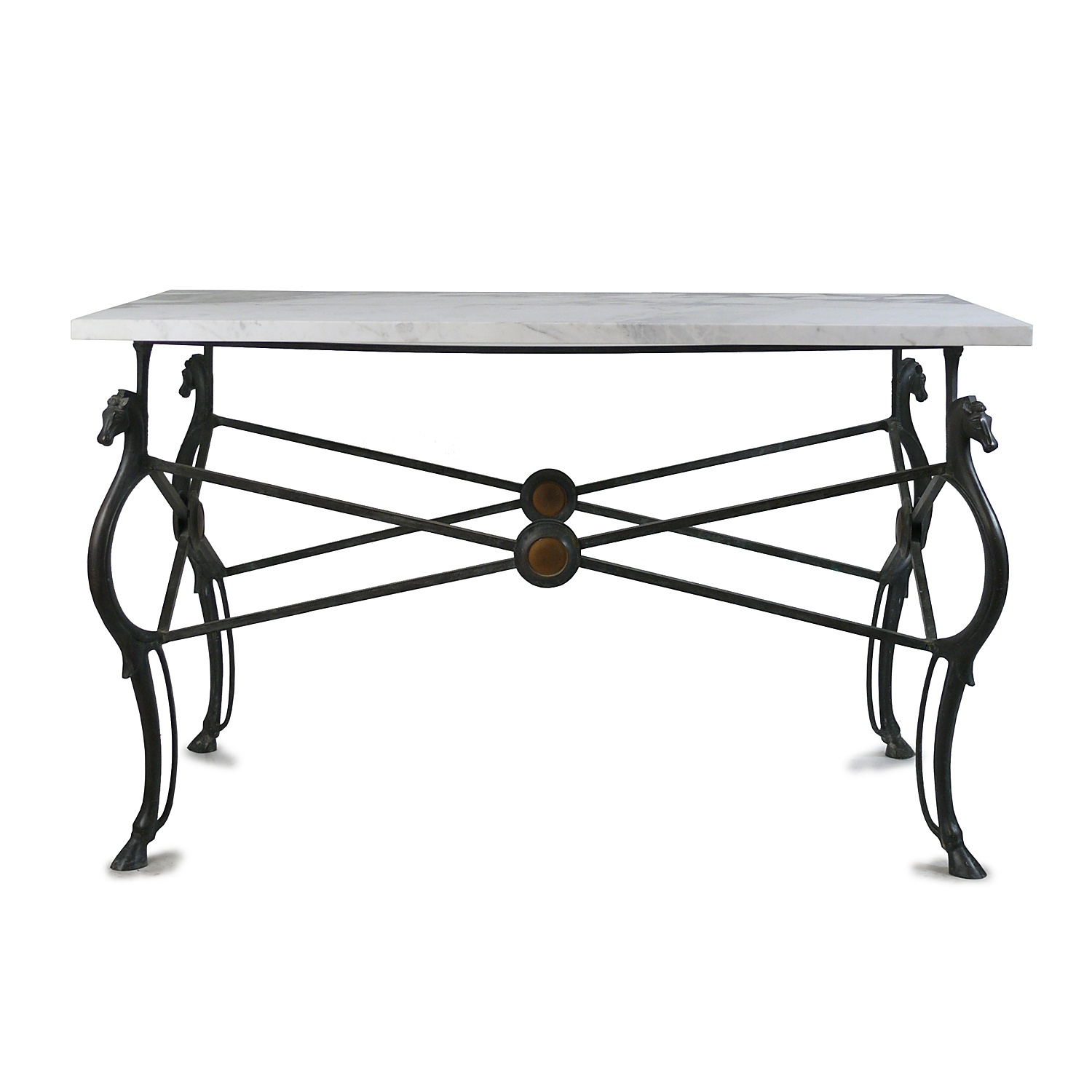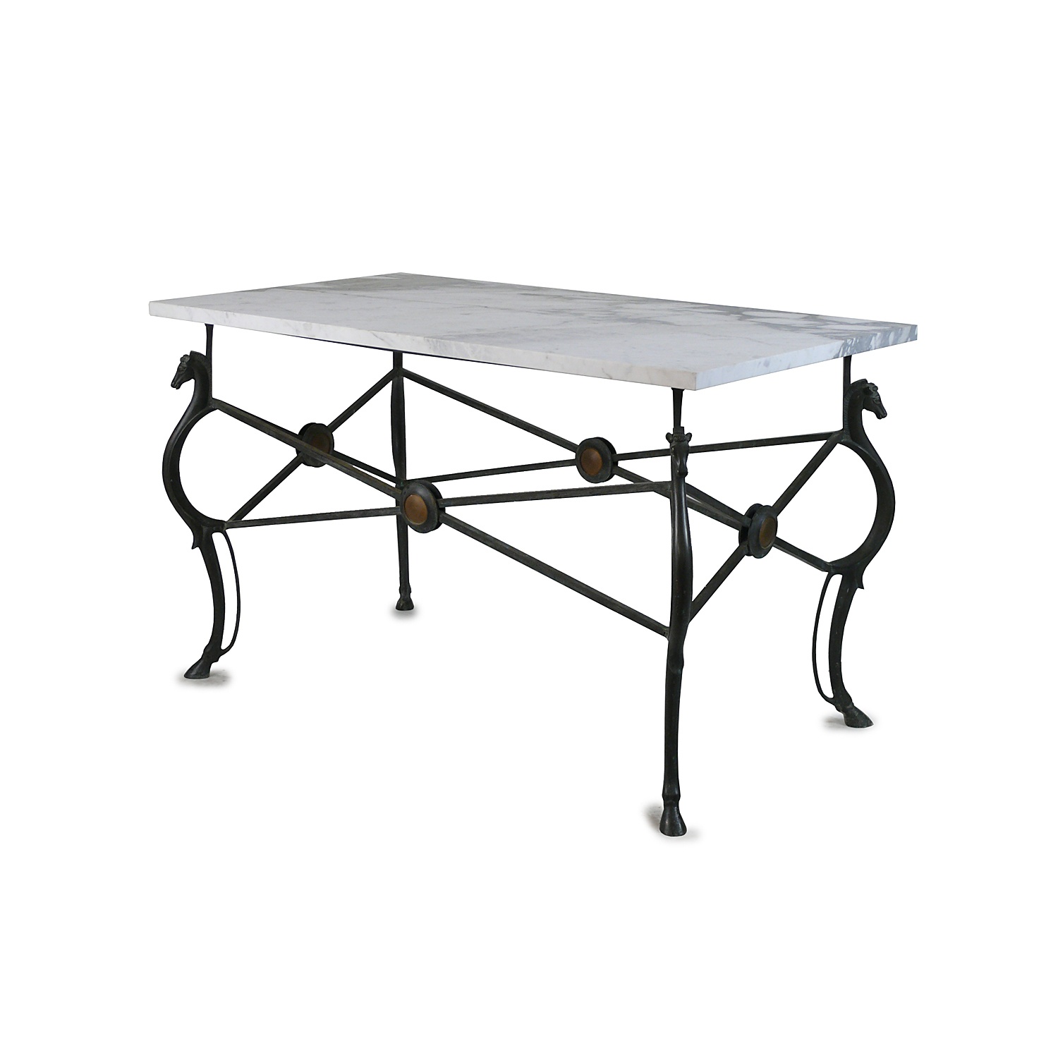 ROMAN POMPEII STYLE CENTRE TABLE BRONZE X FRAME WITH HORSE CORNERS AND A WHITE CARRARA MARBLE TOP 81 CM HIGH 135 CM LONG 75 CM WIDE