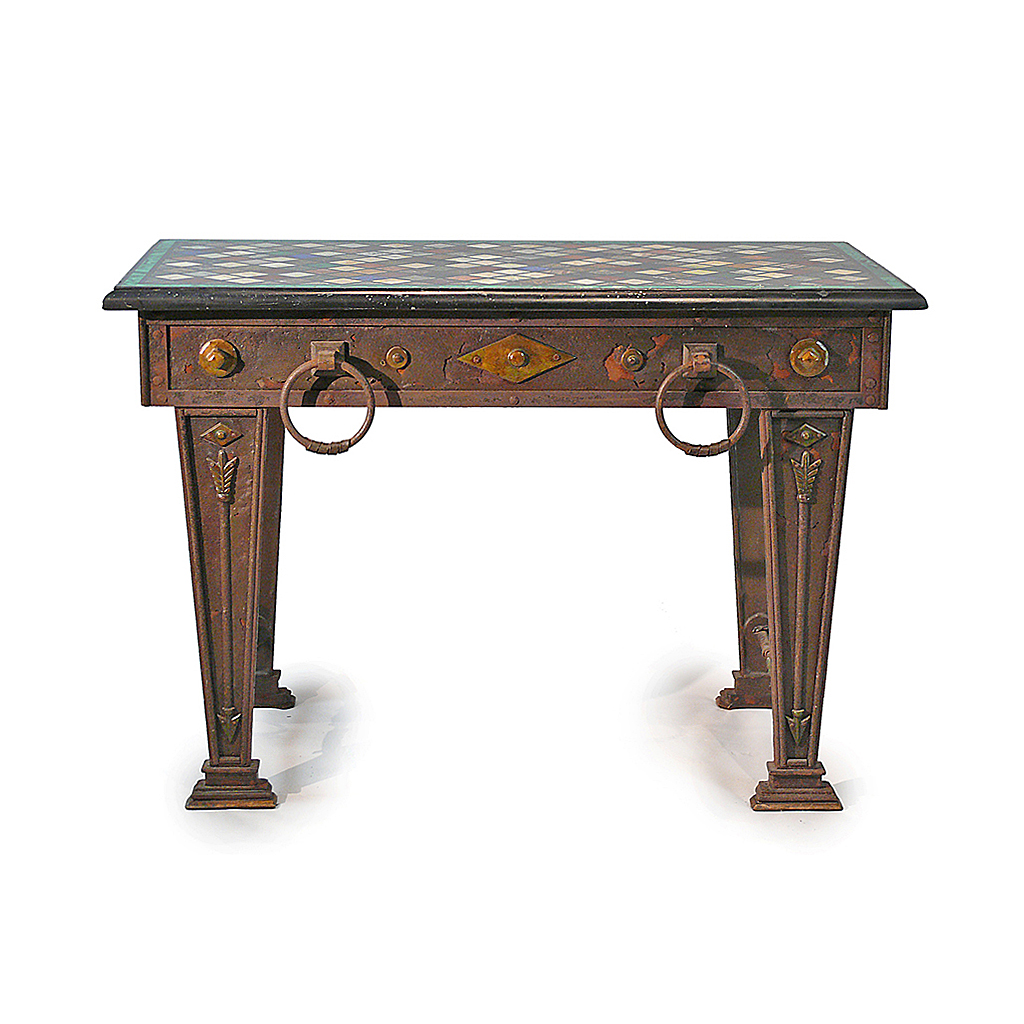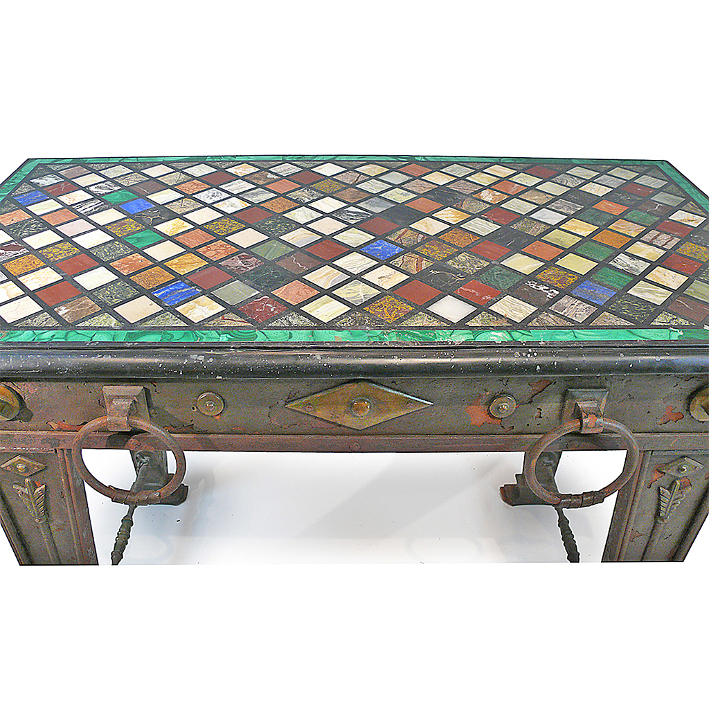 ROMAN STYLE CENTRE TABLE RECTANGULAR WROUGHT IRON WITH ARROW LEGS FINE SPECIMEN MARBLE CHEQUERED TOP WITH MALACHITE BORDER 122 CM LONG (X2)