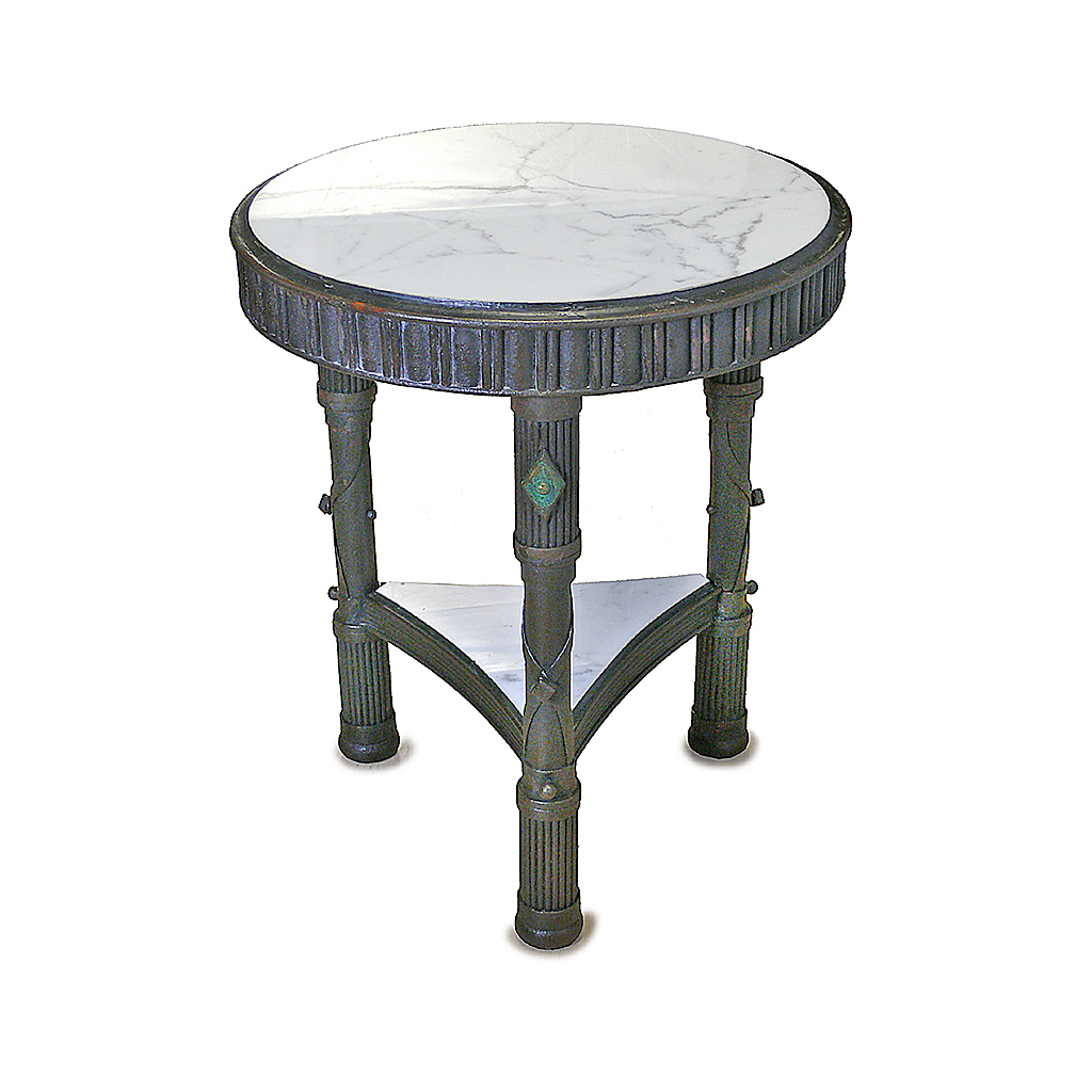 ROMAN STYLE LOW TABLE WROUGHT IRON WITH BRONZE MOUNTS QUIVER LEGS WHITE MARBLE TOP AND LOWER TIER 63 CM HIGH 53 CM DIAM. (X4)