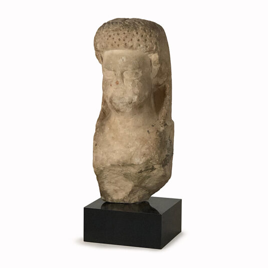 ROMAN WHITE MARBLE HERM / HEAD OF A WOMAN ARCHAISTIC STYLE HER HAIR IN TIGHT CURLS IST CENT AD 41 CM HIGH PLUS BASE 49 CM OVERALL