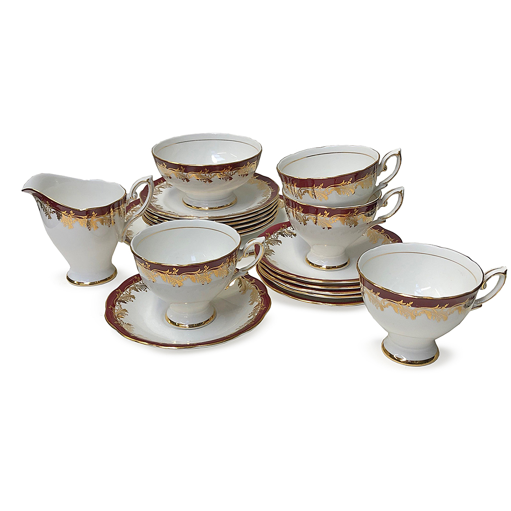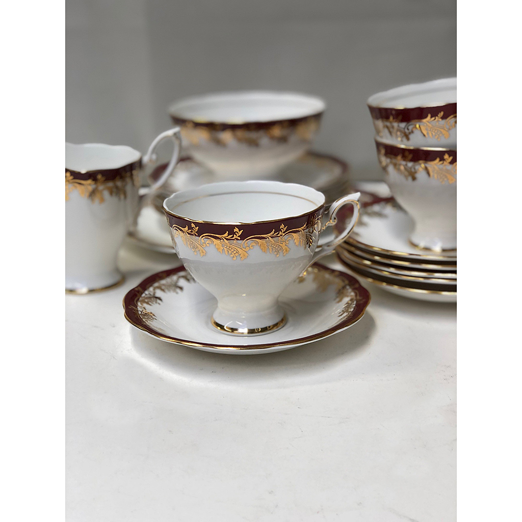 ROYAL STANDARD BONE CHINA TEA SET BURGUNDY AND GOLD ON WHITE INC. 4 CUPS AND SAUCERS 6 TEA PLATES 1 CREAM JUG 1 SLOP BOWL AND 1 CAKE PLATE