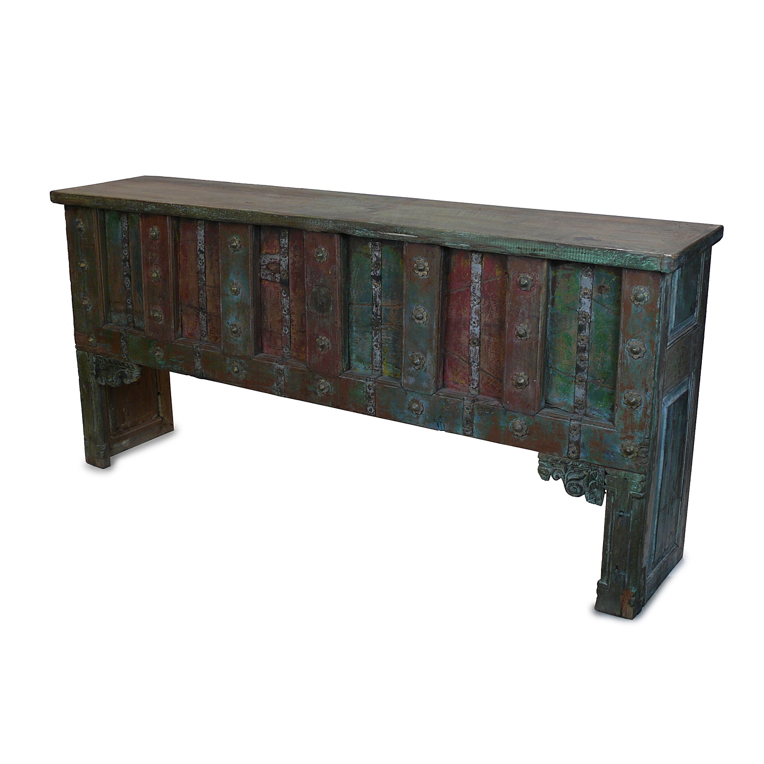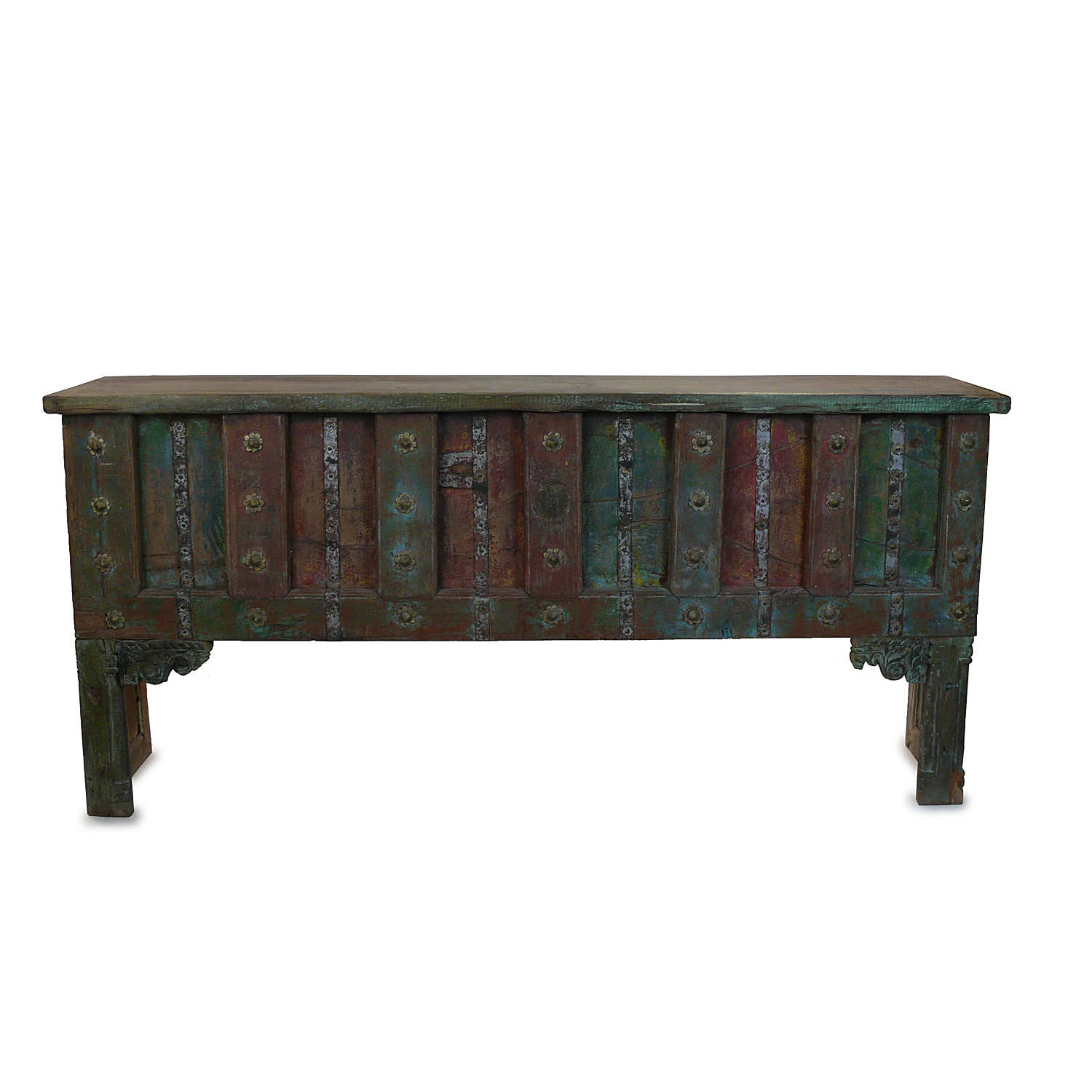 RUSTIC INDIAN SIDE TABLE / BAR UNIT PANELLED FRONT WITH PLANK ENDS RED AND GREEN DISTRESSED FINISH 85 CM HIGH 185 CM WIDE 40 CM DEEP