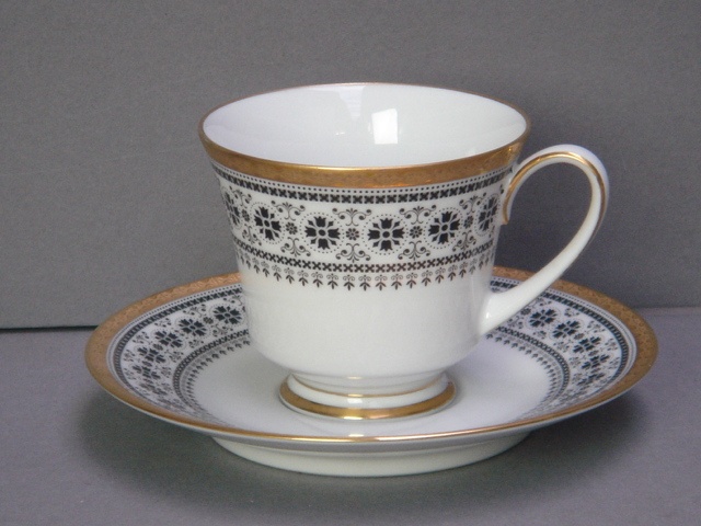 SCHEHEREZADE COFFEE CUP AND SAUCER BLACK AND GOLD BORDER PAT. (X2)
