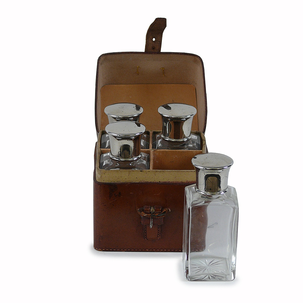 SET OF FOUR GLASS SCENT BOTTLES WITH CHROME TOPS IN FITTED TAN LEATHER CASE