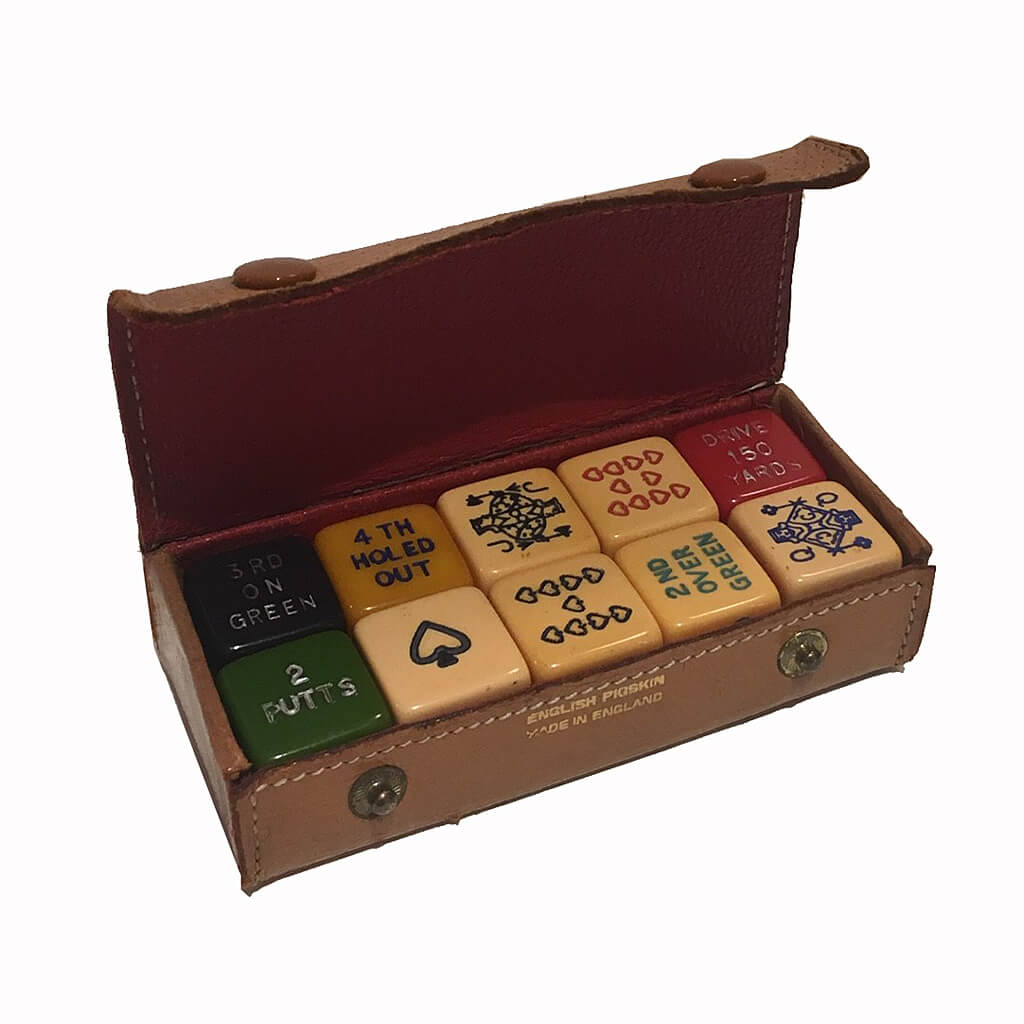 SET OF GAME DICE IN FITTED TAN PIGSKIN LEATHER CASE