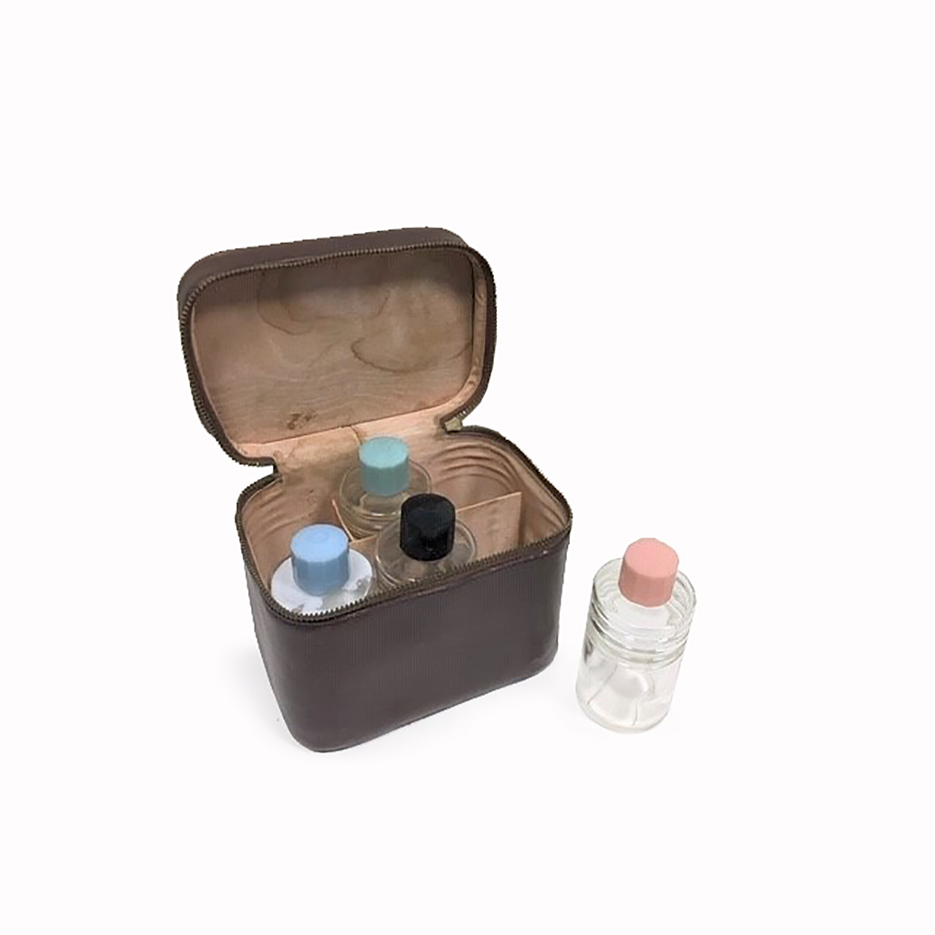 SET OF MID-CENTURY TOILET SCENT BOTTLES WITH COLOURED LIDS IN ZIP UP LEATHER TRAVEL CASE (INCOMPLETE)