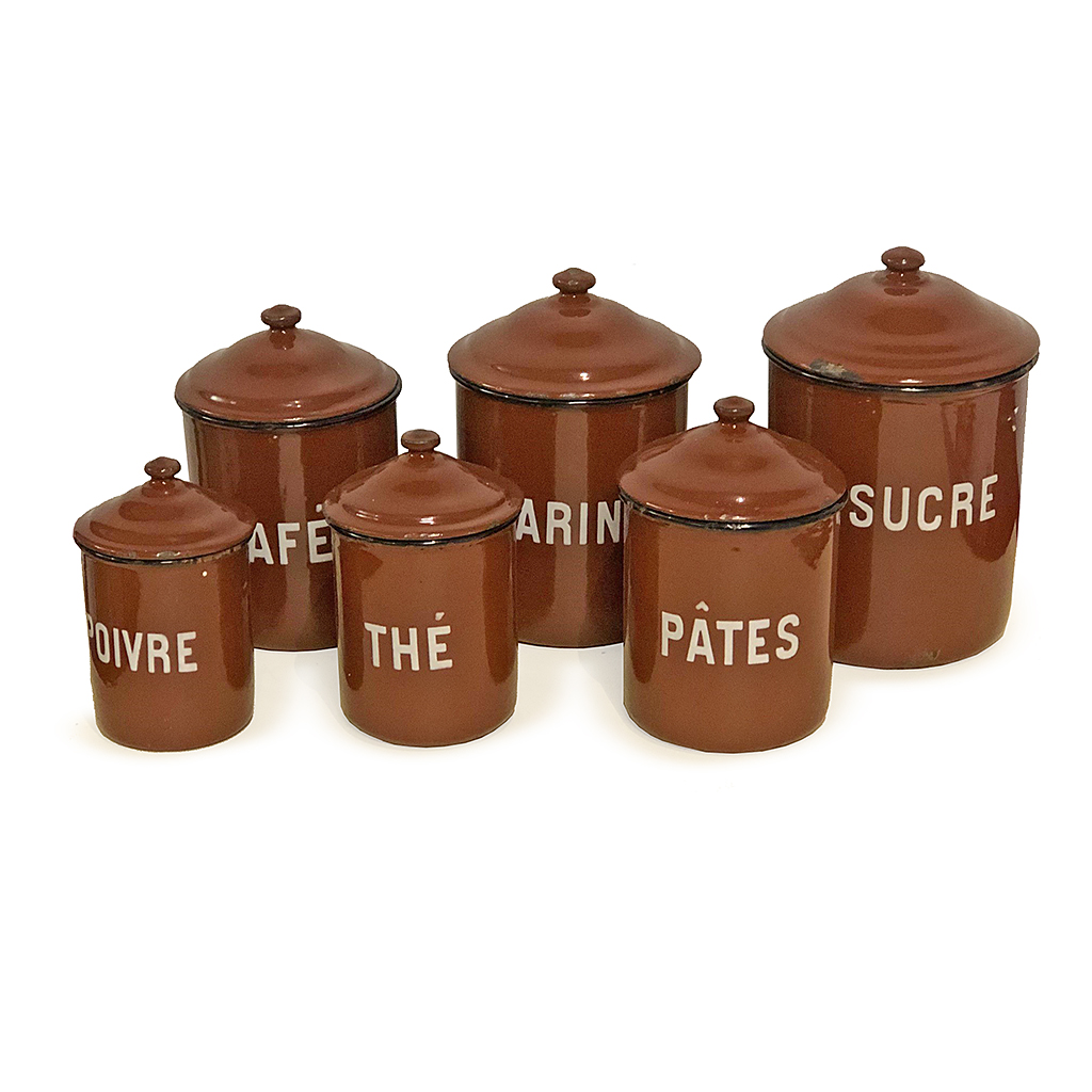 SET OF SIX FRENCH BROWN ENAMEL STORAGE JARS AND LIDS CAFE SUCRE POIVRE ETC.12 CM - 20 CM HIGH