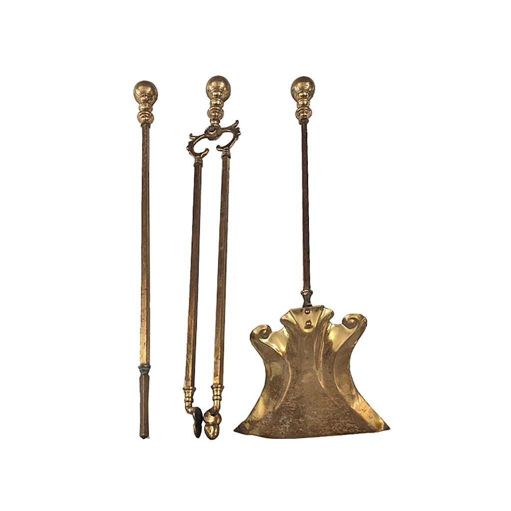 SET OF THREE BRASS FIRE TOOLS ART NOUVEAU POKER SHOVEL AND TONGS 71 CM LONG CIRCA 1900