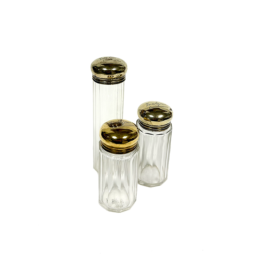 SET OF THREE RIDGED TOILET / PERFUME POTS WITH GOLD PLATED LID AND ENGRAVED ''EVELYN'' 2 X 9 CM HIGH / 1 X 14 CM HIGH