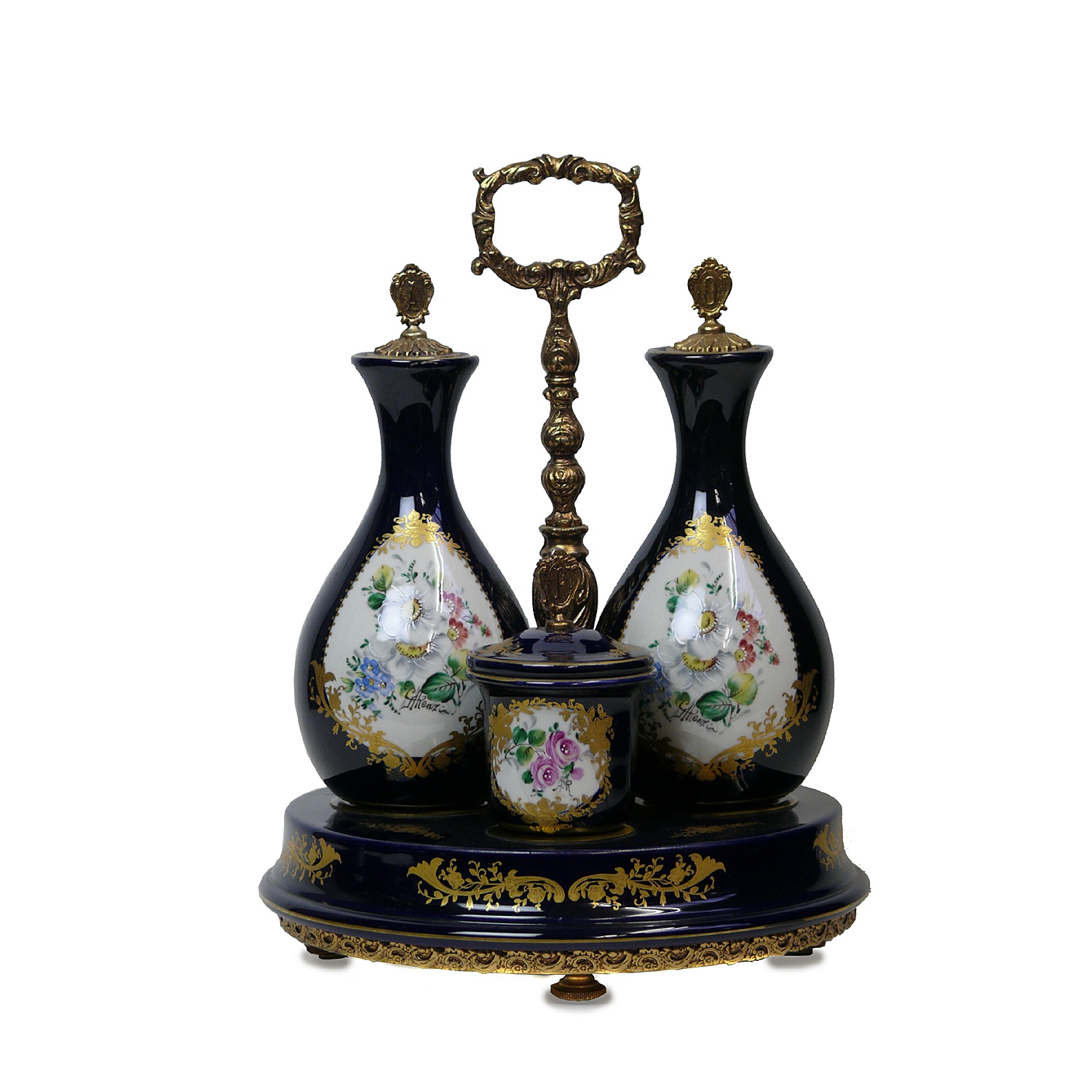 SEVRE BLUE AND GILT DECORATED PORCELAIN CRUET STAND FIVE PIECE INCLUDING STAND, TWO BOTTLES WITH GILT STOPPERS 1 COVERED MUSTARD POT AND OPEN SALT POT 19CM HIGH