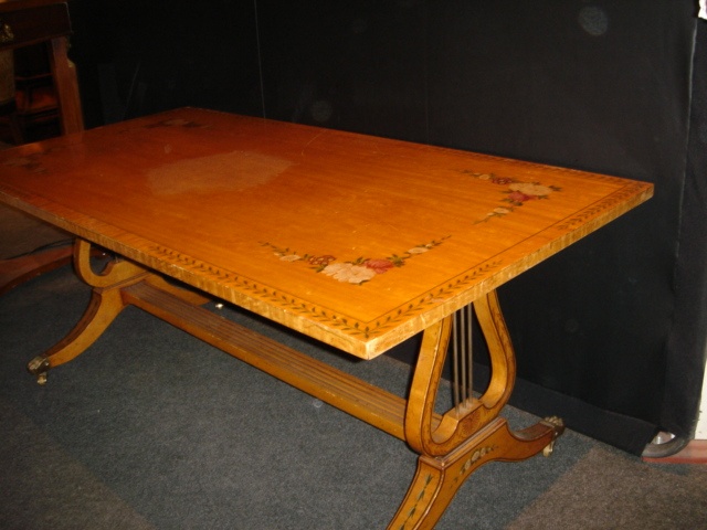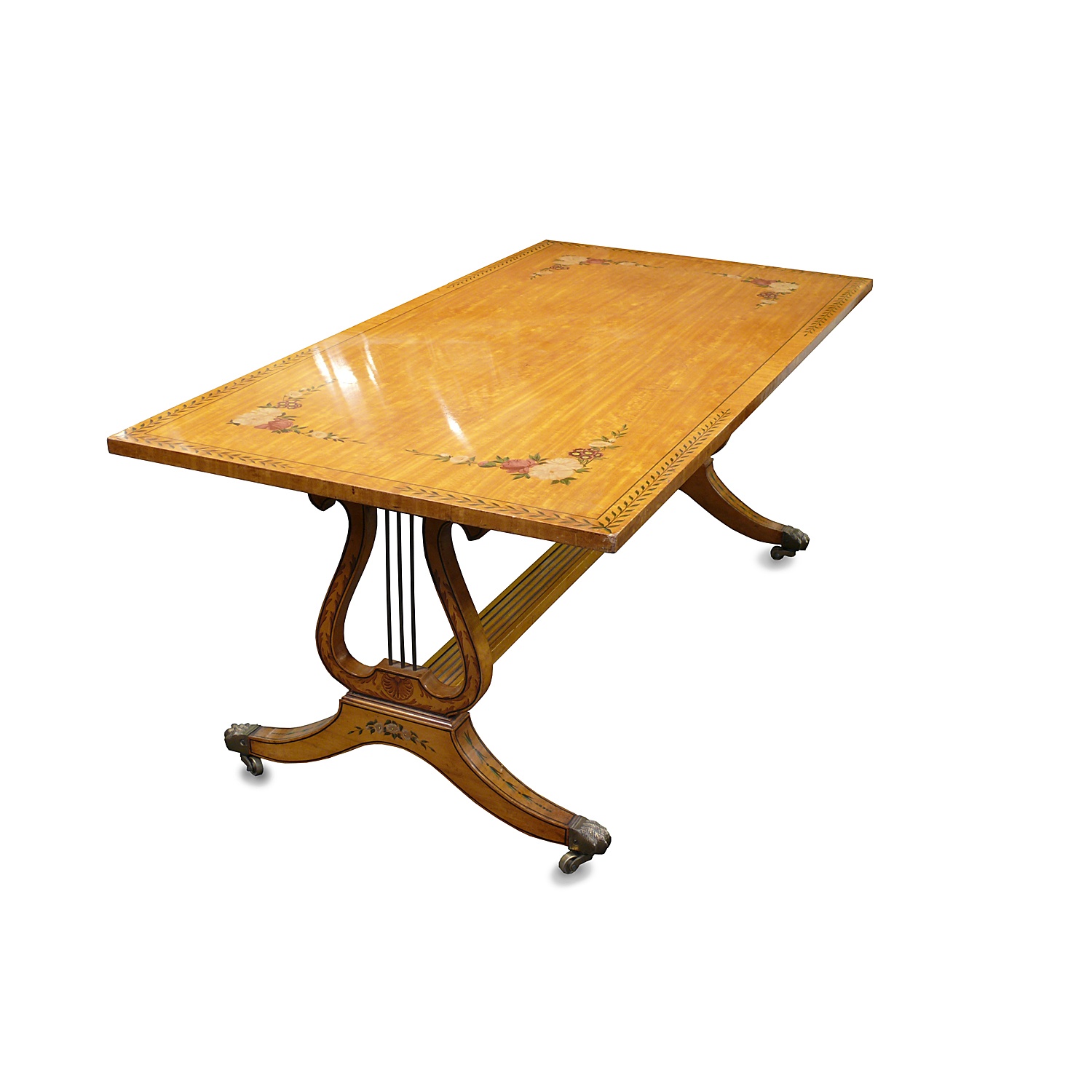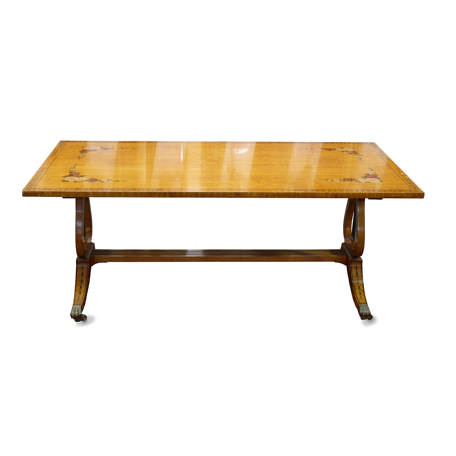 SHERATON DECORATED SATINWOOD COFFEE TABLE LYRE ENDS 48 CM HIGH 122 CM LONG 60 CM WIDE