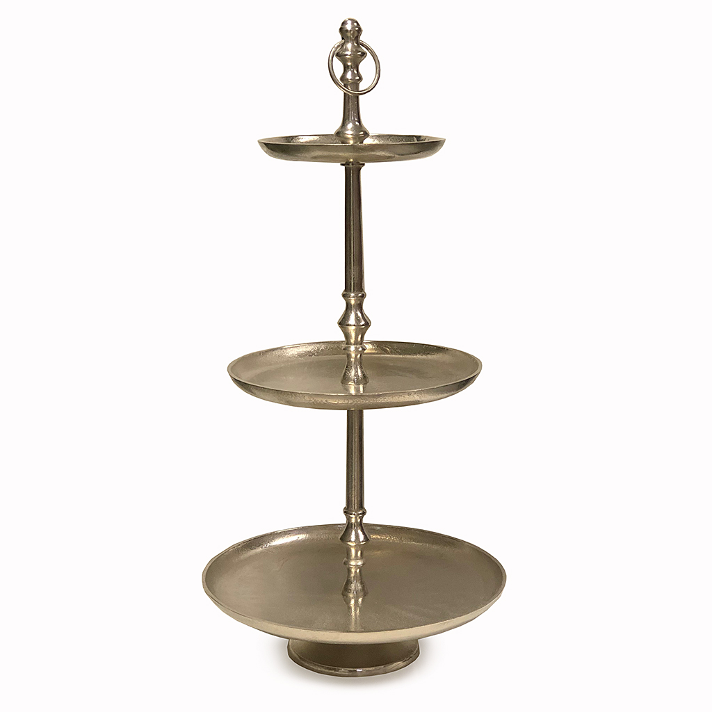SILVER ALUMINUM PLATED STEEL THREE TIER CAKESTAND WITH RING HANDLE 74 CM HIGH