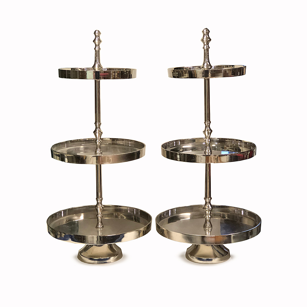 SILVER ALUMINUM PLATED THREE TIER CAKESTAND 76 CM HIGH (X2)