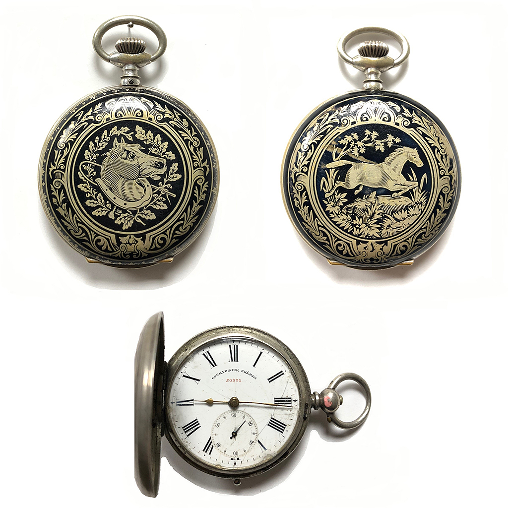 SILVER AND BLACK ENAMEL HORSE DECORATION POCKET WATCH