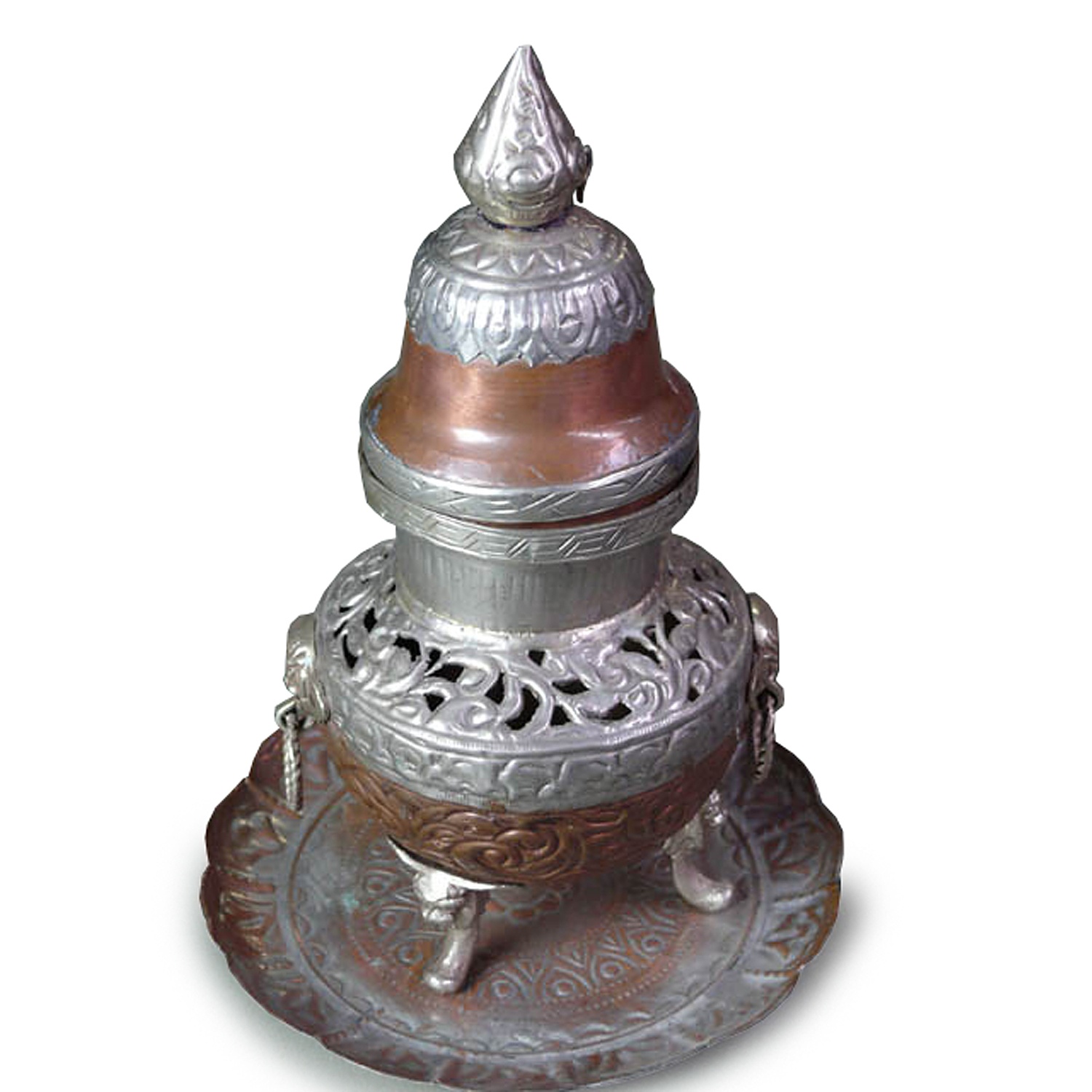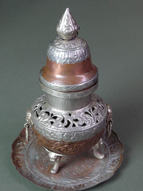 SILVER AND COPPER INCENSE BURNER WITH LID AND SAUCER / TRAY TOMBAK OTTOMAN STYLE