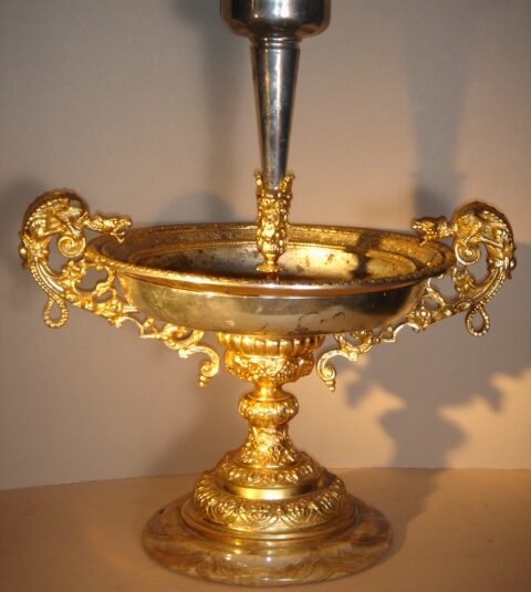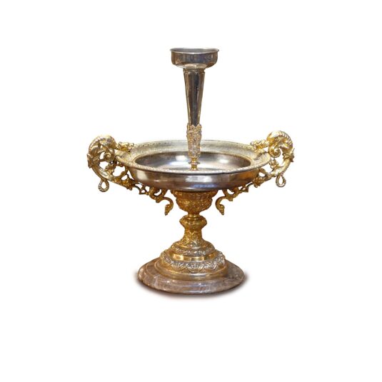SILVER AND GILT BRONZE EPERGNE / TAZZA WITH DRAGON HANDLES AND BROWN ONYX BASE 1'6/i HIGH 1'2/i DIAM 46 CM 36 CM