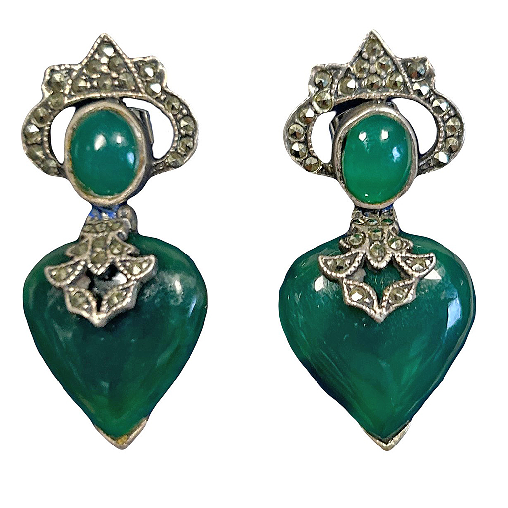 SILVER AND MARCASITE DROP EARRINGS WITH JADE STONE IN A SHEAPE OF A HEART