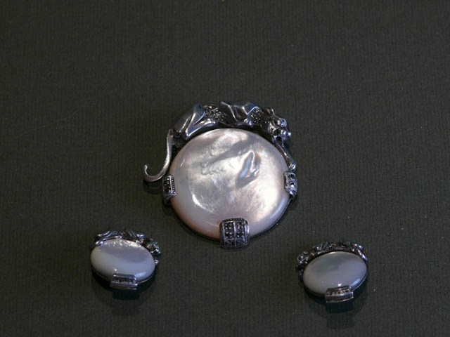SILVER AND MOTHER OF PEARL PANTHER BROOCH AND MATCHING EARRINGS FROM THE DUCHESS OF WINDSOR COLLECTION