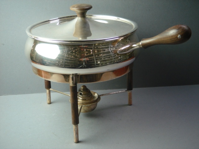 SILVER CHAFING DISH WITH WOOD HANDLE AND KNOB HANDLED LID COMPLETE WITH MATCHING STAND AND BURNER 24 CM