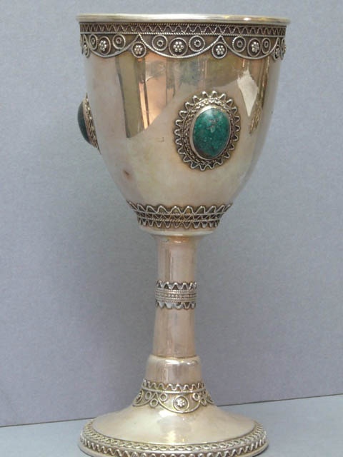 SILVER CHALICE TYPE GOBLET ORNATE FILIGREE AND GREEN JEWEL ENCRUSTED