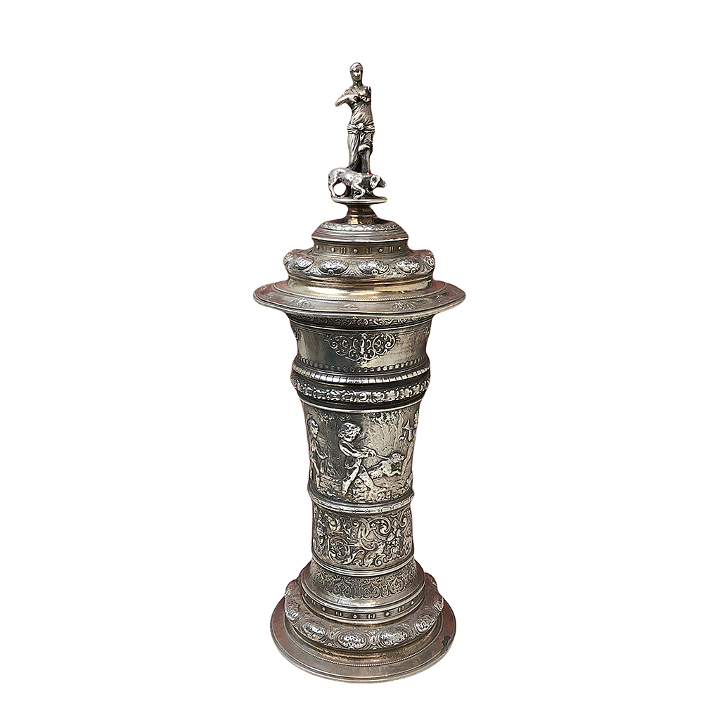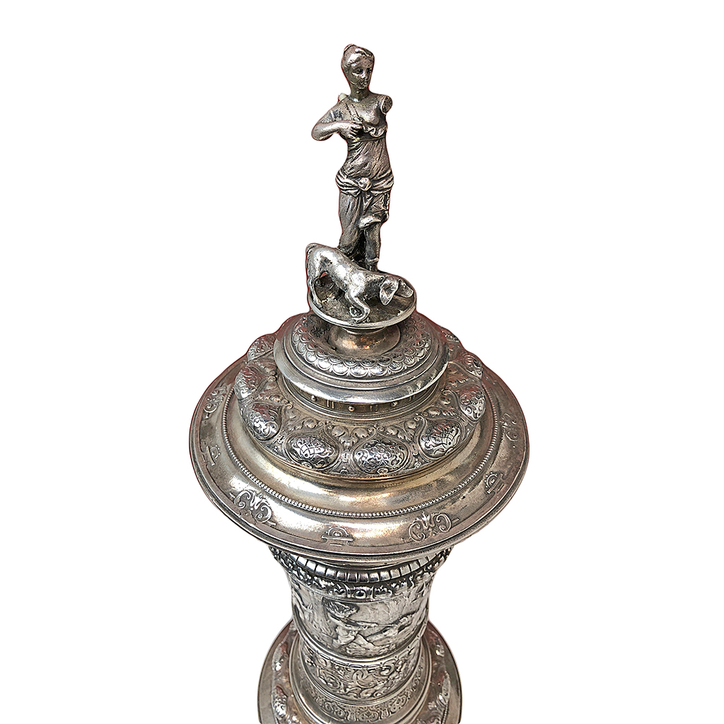 RENAISSANCE STYLE SILVER CHALICE VASE AND COVER WITH DIANA FINIAL ELKINGTON 44 CM HIGH 16 CM DIAM