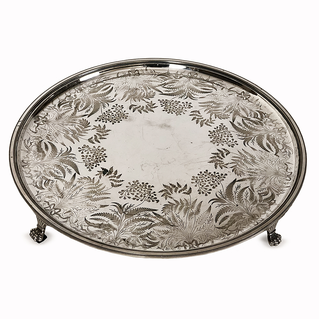 SILVER CIRCULAR FERN LEAF DECORATED TRAY ON FOUR LIONS FOOT FEET 42 CM DIAM