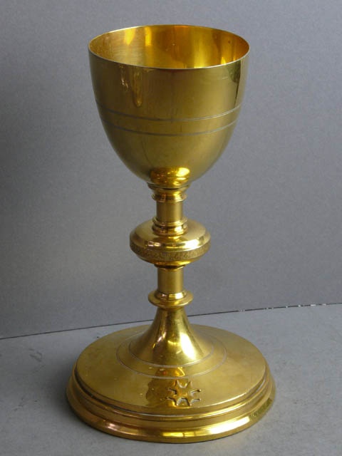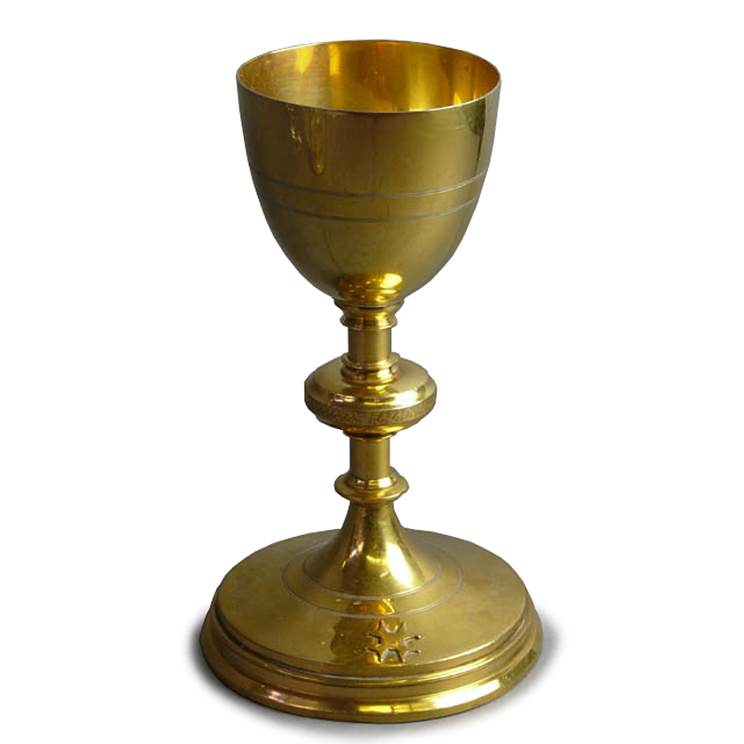 SILVER GILT CHALICE WITH FLOWER DETAIL ON STEM SMALL EMBLEM ON BASE