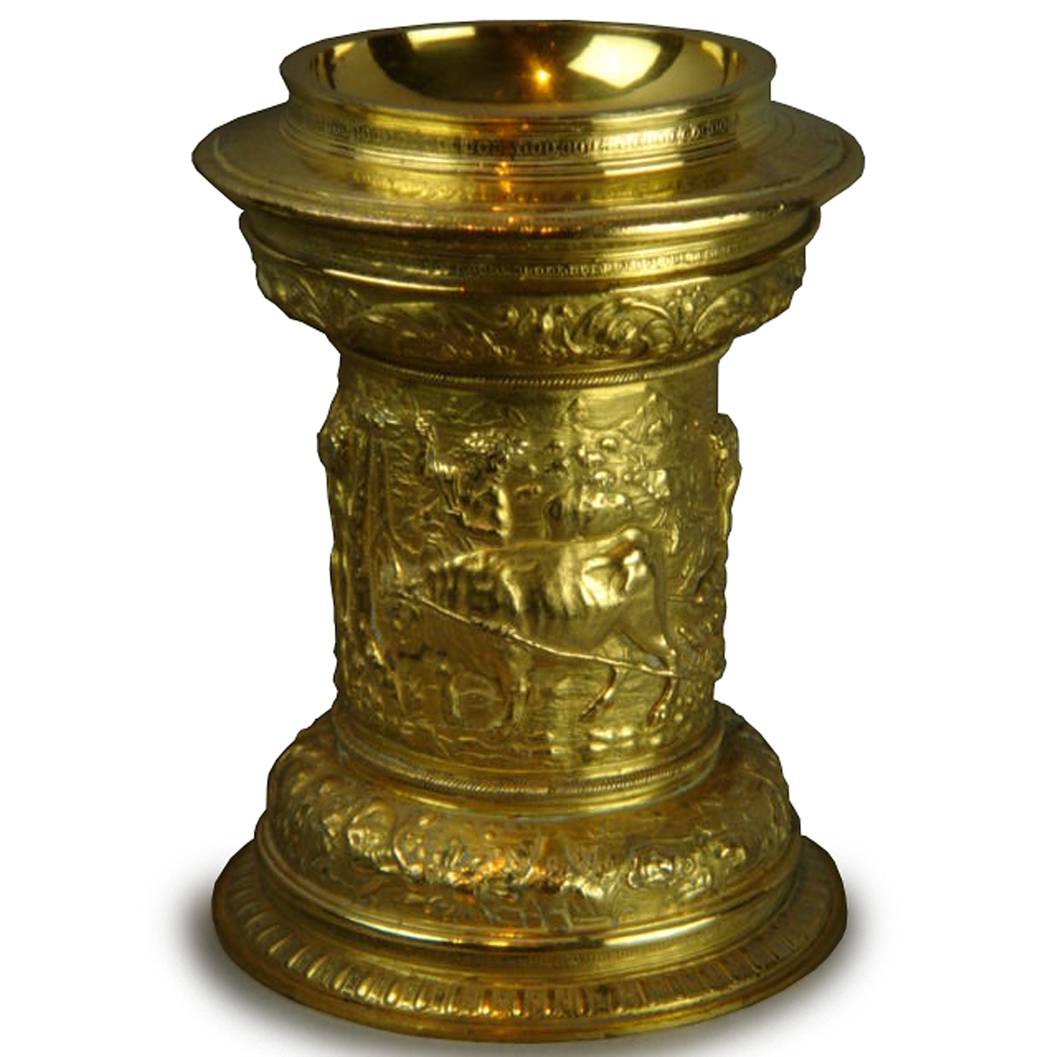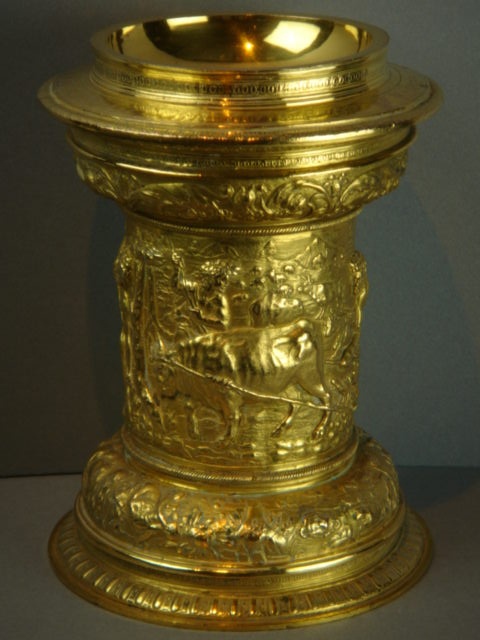 SILVER GILT STANDING SALT BULL RELIEF DECORATION JAMES I 8/i HIGH 21 CM