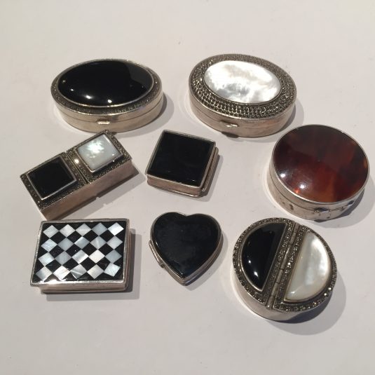 SILVER HALLMARKED PILL / SNUFF BOX WITH ENAMEL / MOTHER OF PEARL / PASTE DECORATED LID