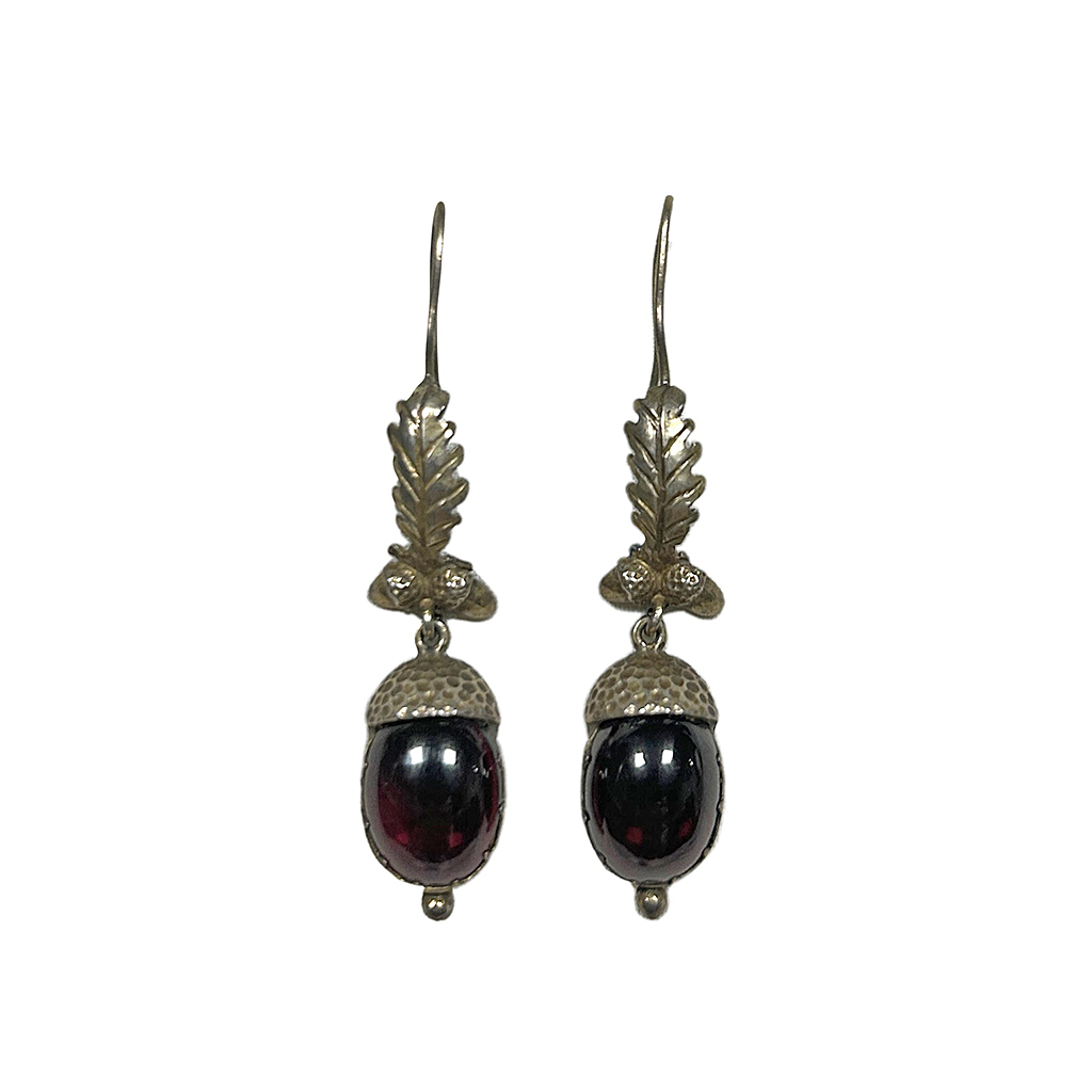 SILVER LEAF AND ACORN DESIGN EARRINGS WITH RED GLASS DROP