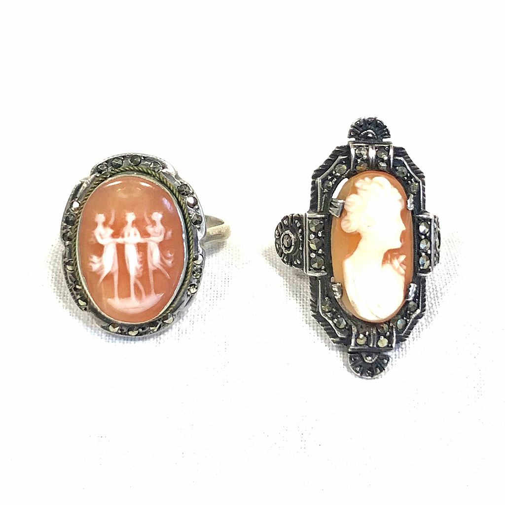 SILVER MARCASITE AND CAMEO LADIES RING