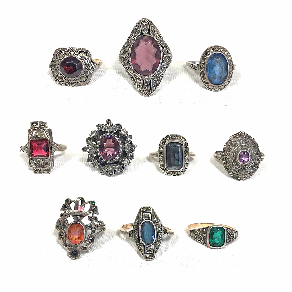 SILVER MARCASITE AND COLOURED PASTE STONE LADIES RING