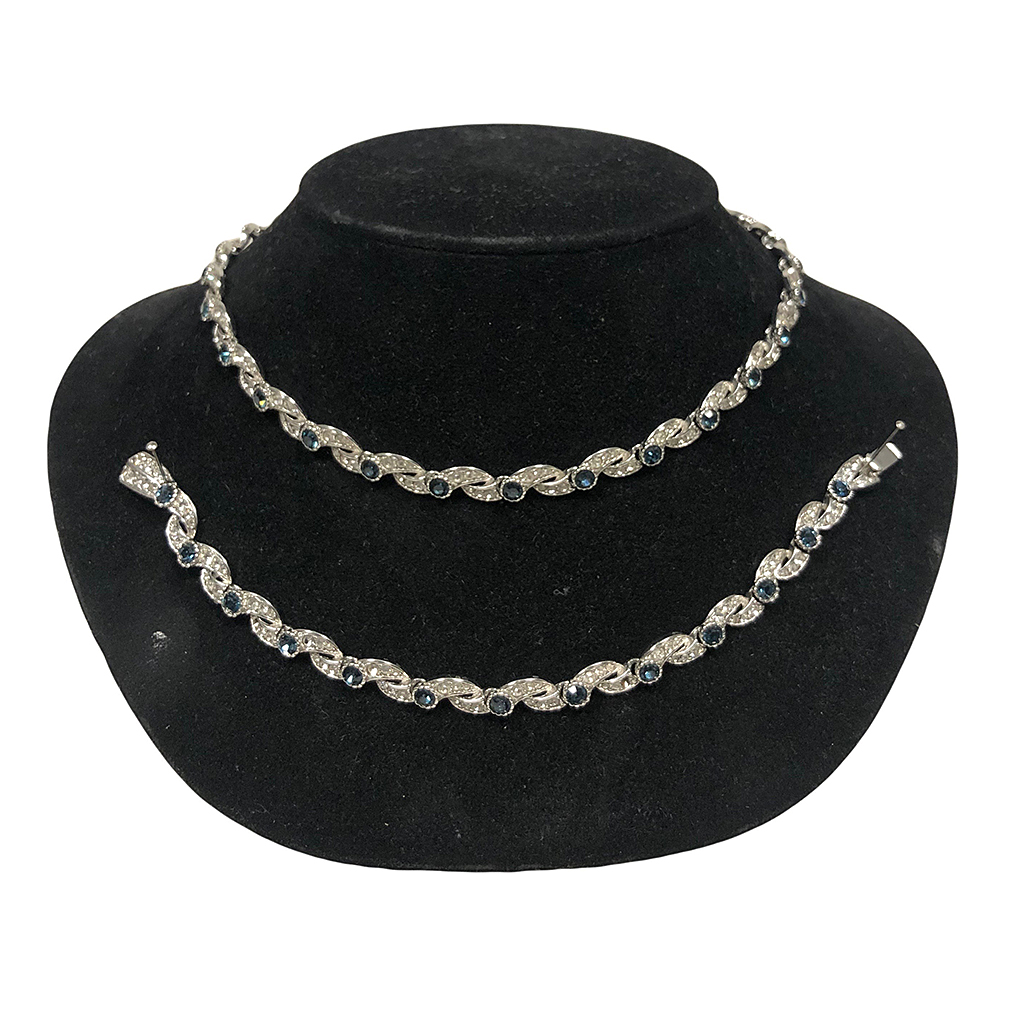 SILVER METAL NECKLACE AND BRACELET SET WITH TWIST LINKS WITH CLEAR AND MAUVE PASTE STONES