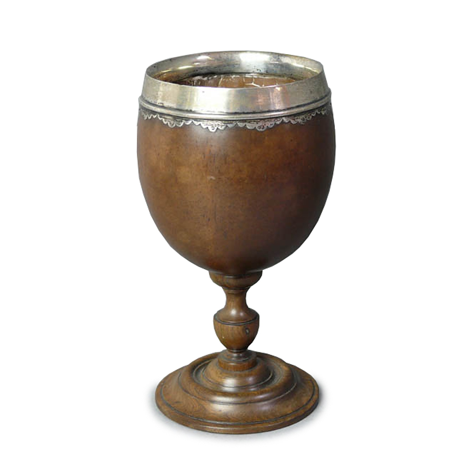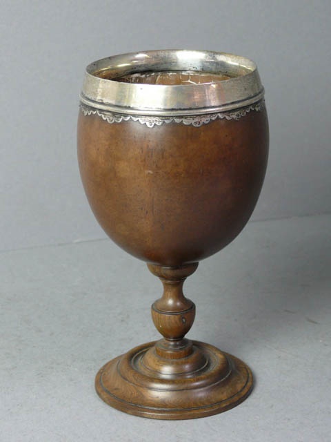 SILVER MOUNTED TREEN GOBLET WALNUT WITH TURNED STEM 18 CM HIGH