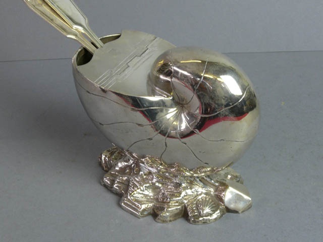 SILVER NAUTILUS SHELL SPOON WARMER WITH ROCK DESIGN BASE 14 CM HIGH