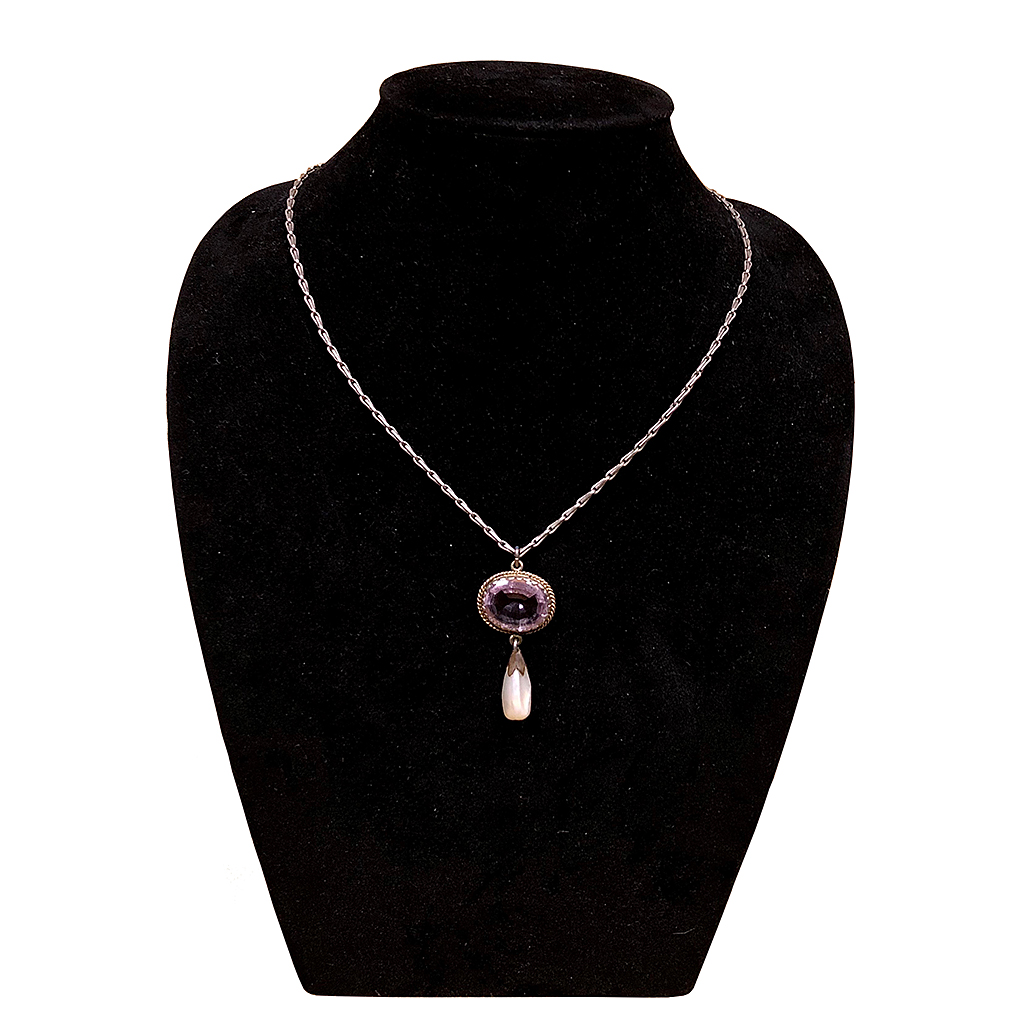 SILVER NECKLACE WITH AMETHYST AND DROP PEARL PENDANT